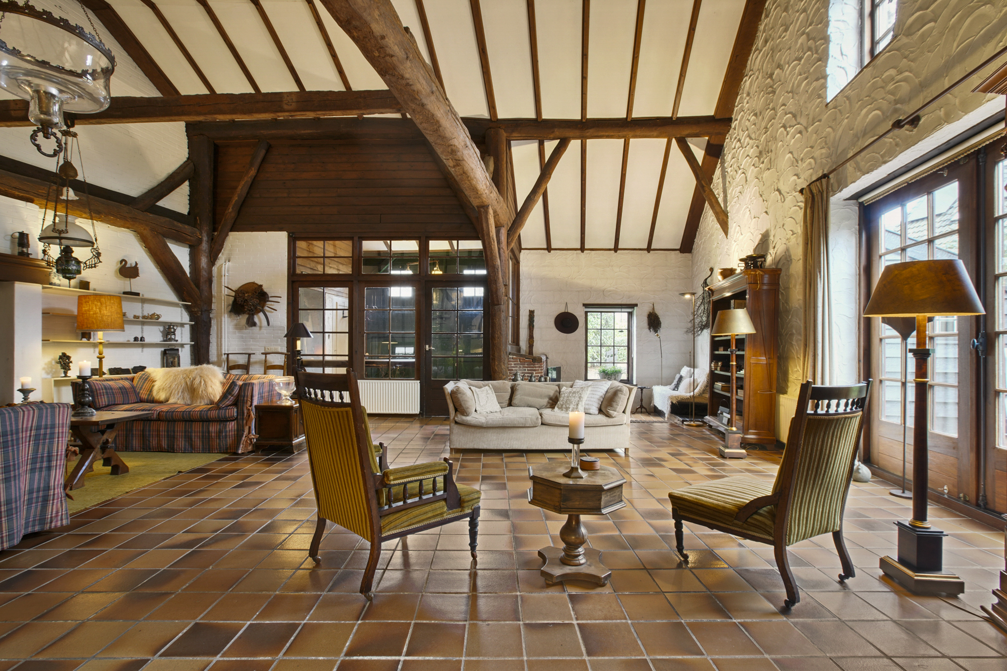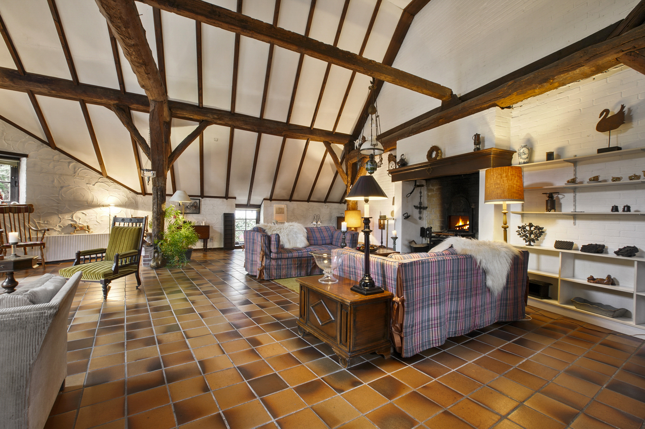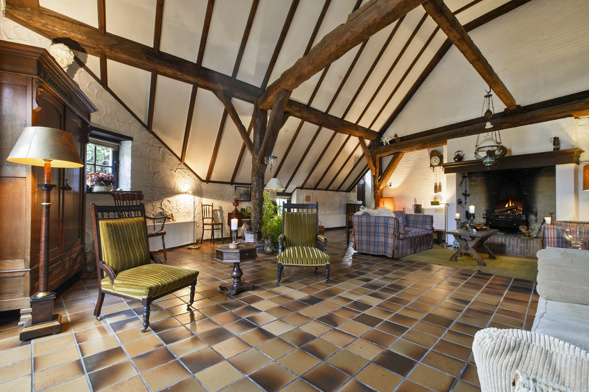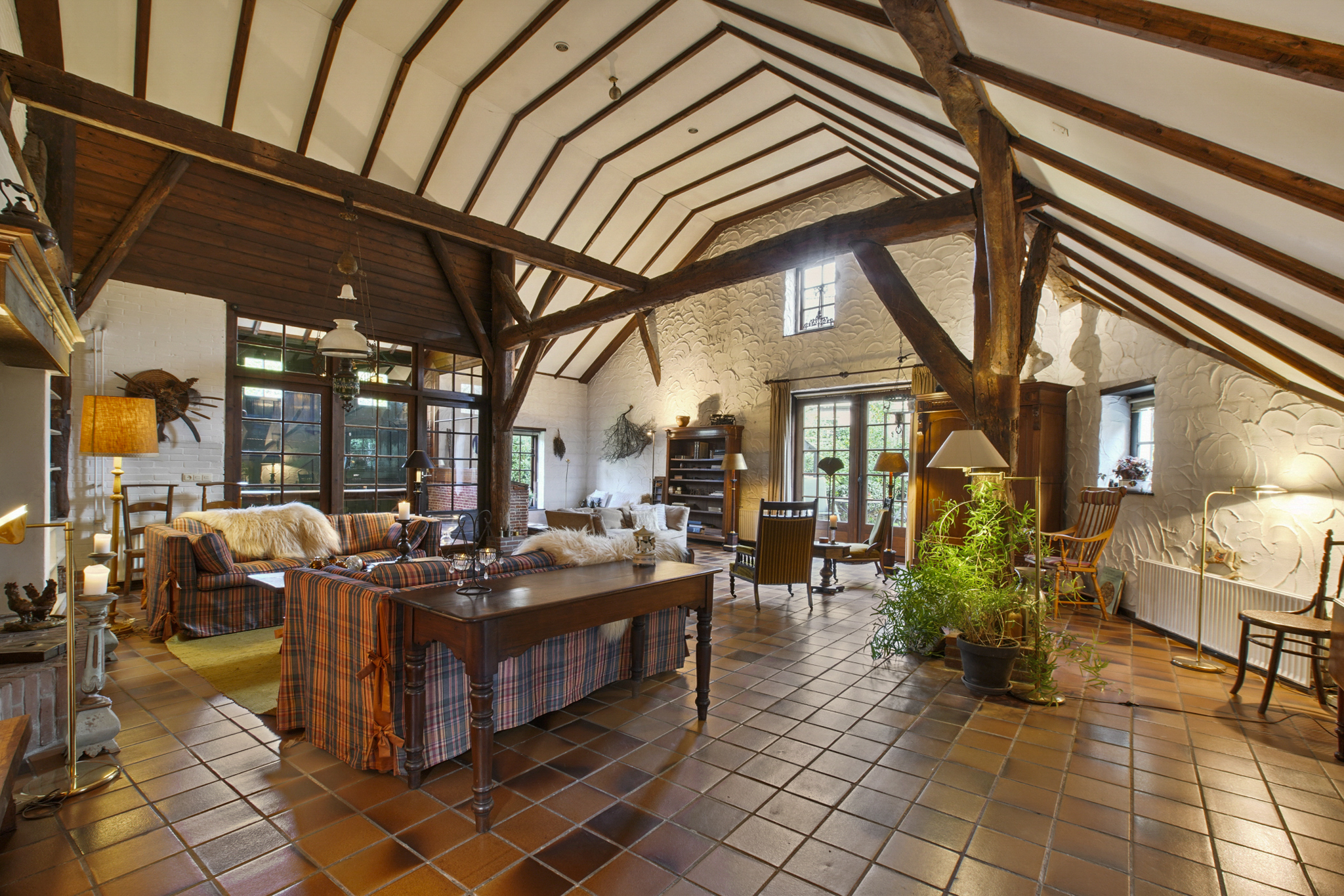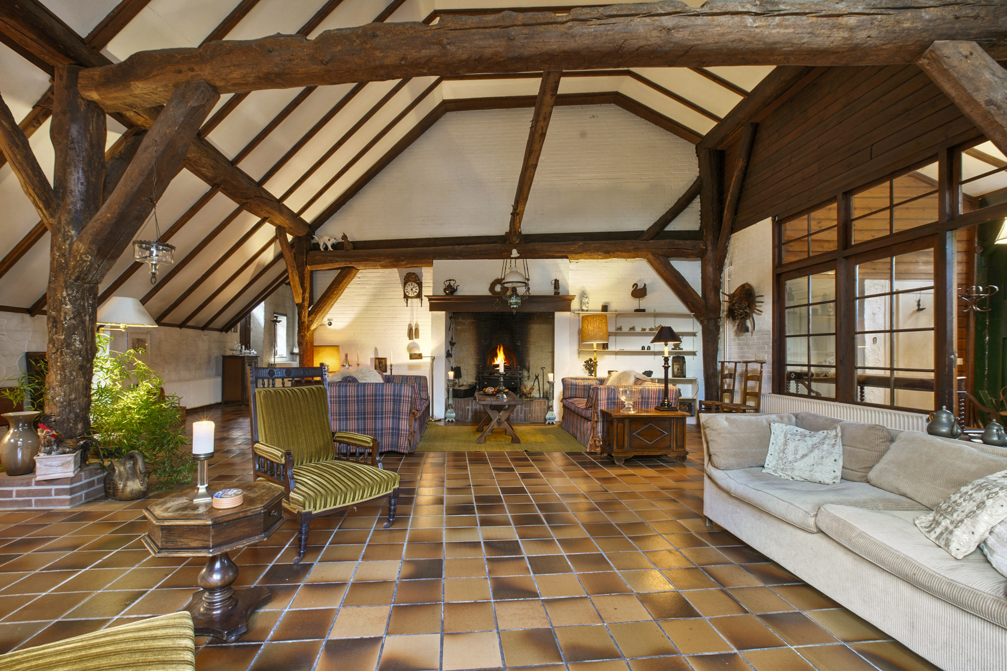 Via de boerendeur in de grote staldeuren, betreedt u de royale entree met toilet en meterkast. Door de glazenwanden valt direct uw oog op de indrukwekkende woonkamer – de voormalige stal – met een hoogte van 5.25 meter en sfeer die u zelden ziet. De woonkamer van maar liefst 93 m2 heeft een prachtig hoog balkenplafond, een sfeervolle openhaard, authentieke stalramen en openslaande deuren naar de zij-tuin.