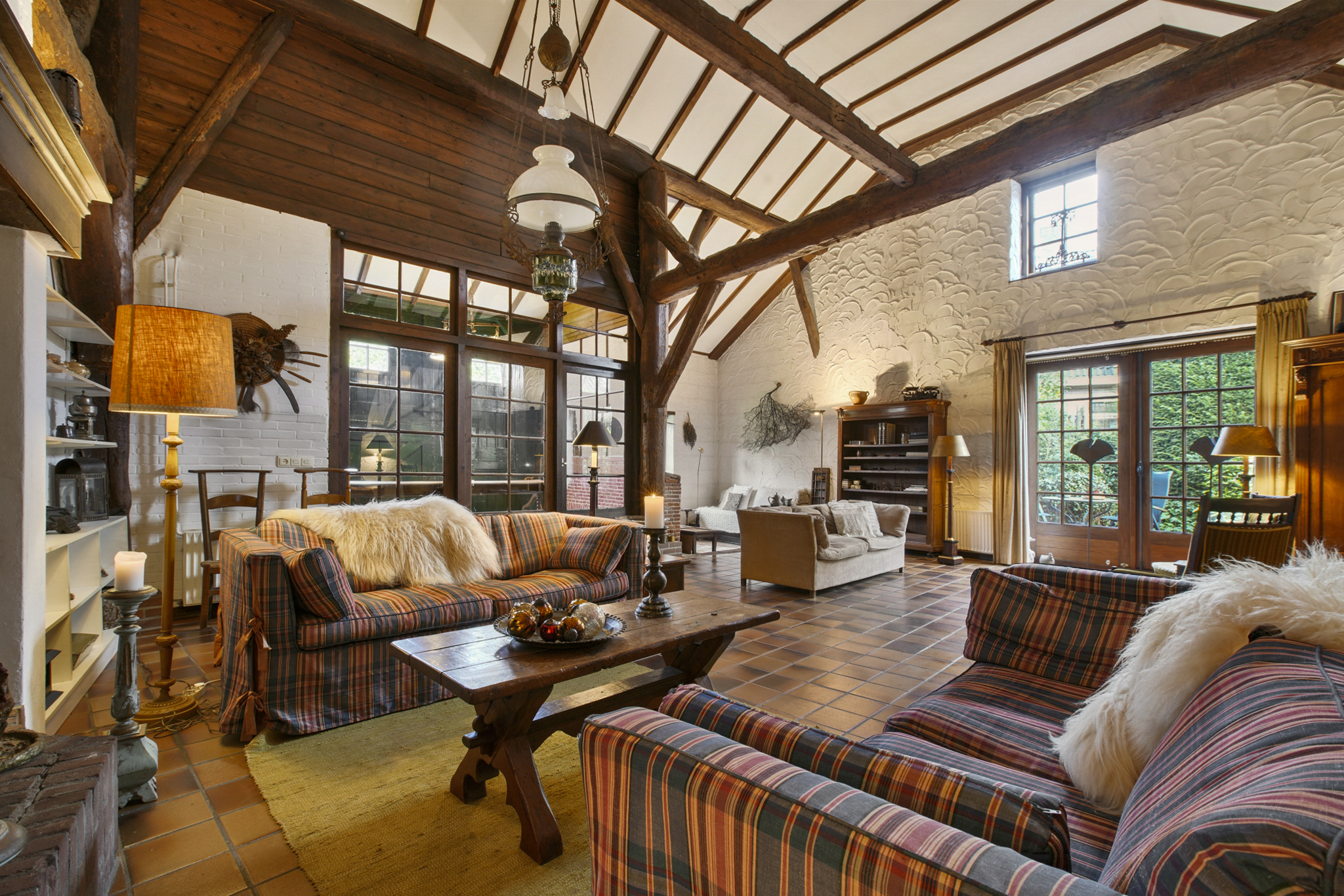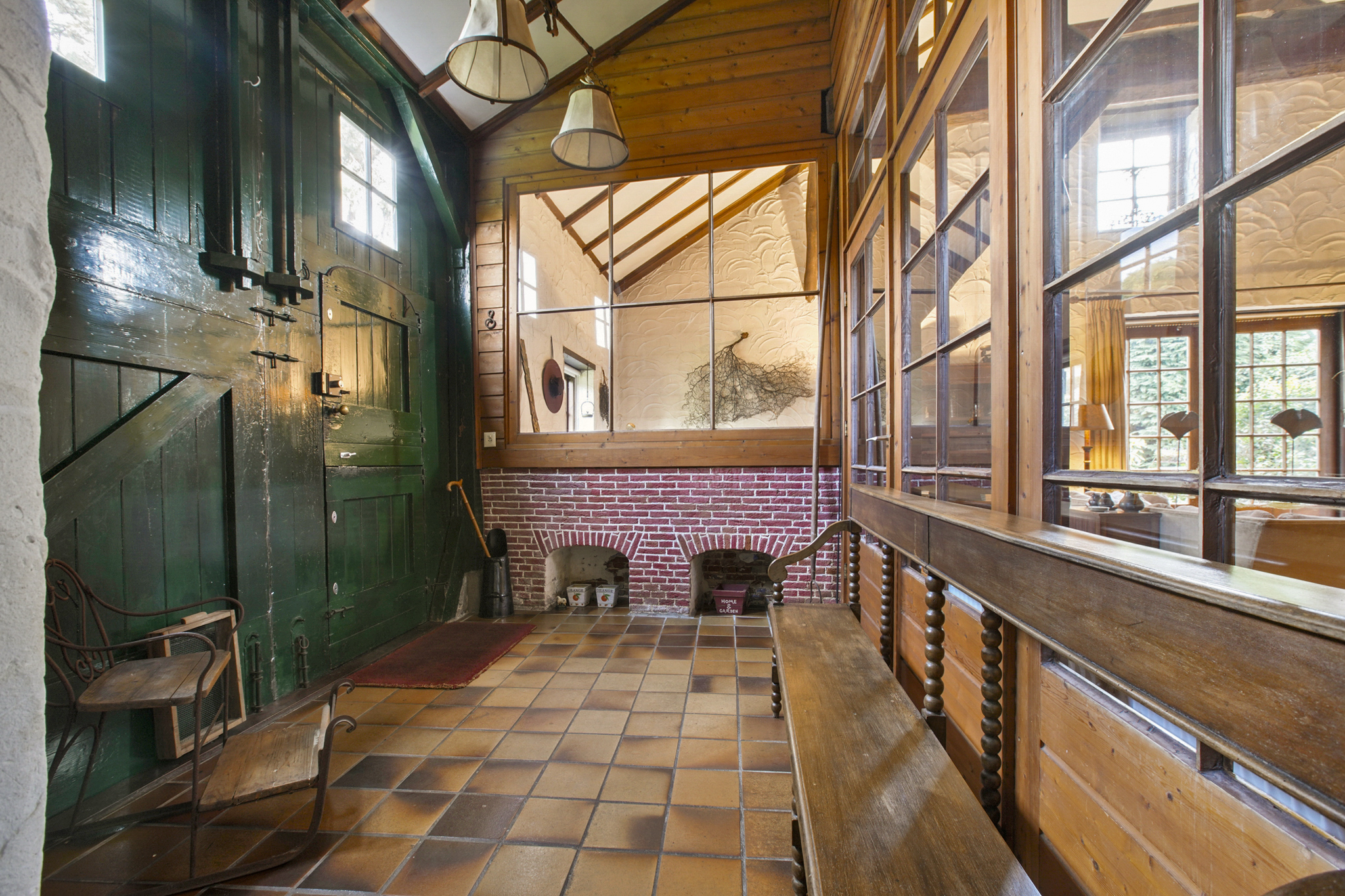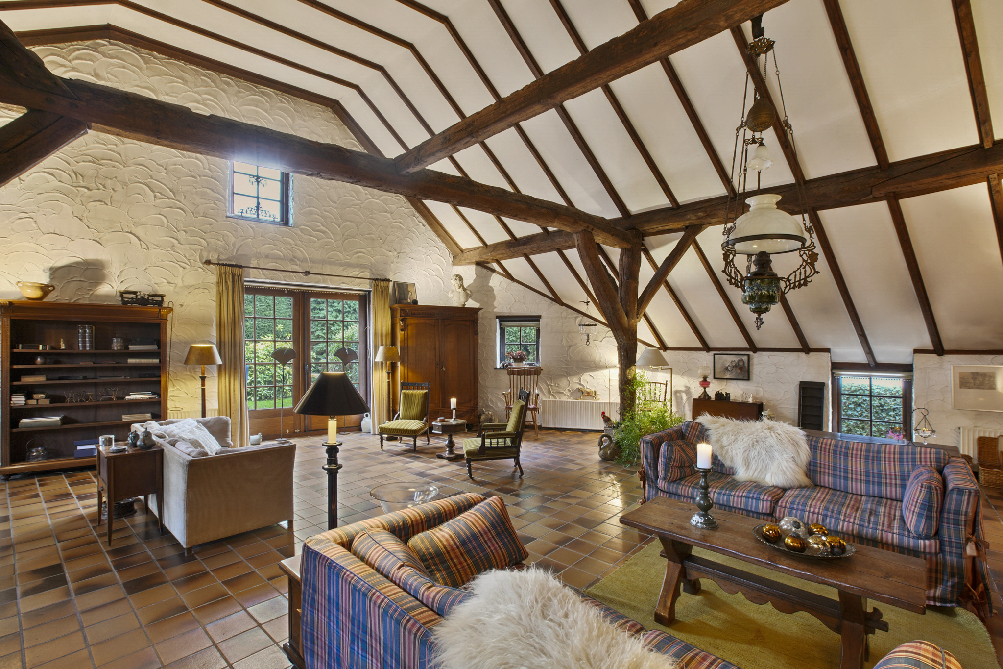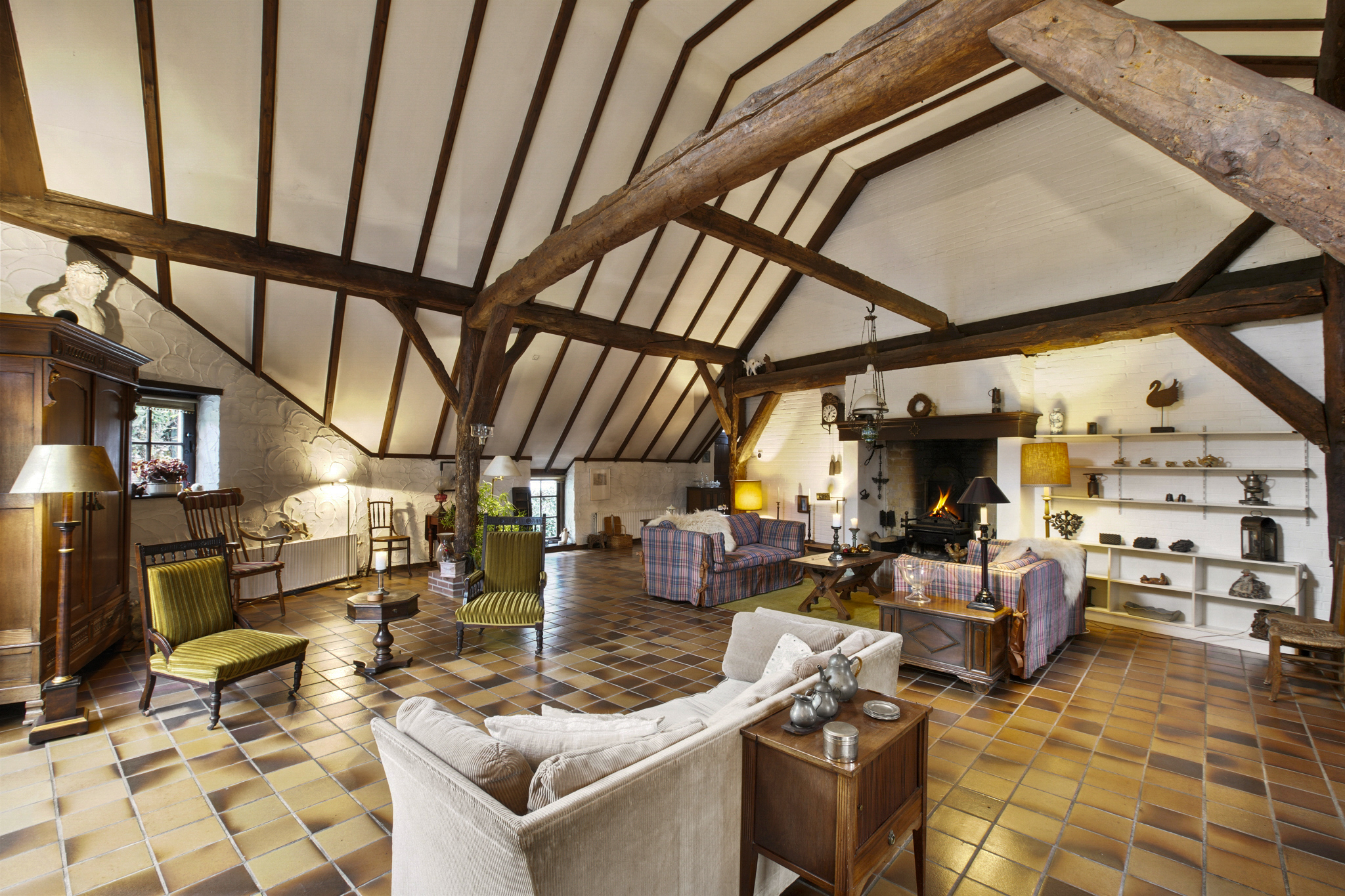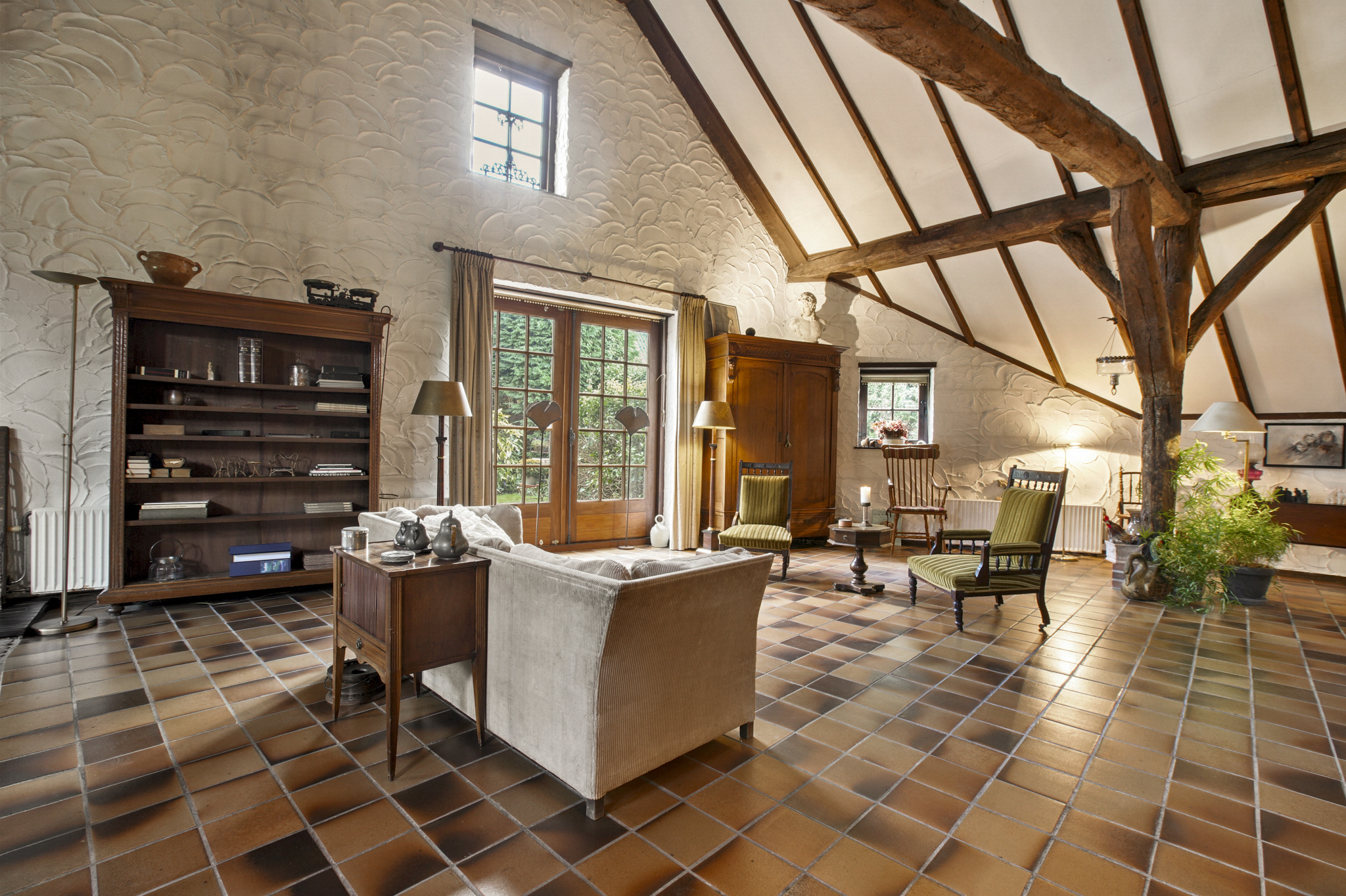 Via de boerendeur in de grote staldeuren, betreedt u de royale entree met toilet en meterkast. Door de glazenwanden valt direct uw oog op de indrukwekkende woonkamer – de voormalige stal – met een hoogte van 5.25 meter en sfeer die u zelden ziet. De woonkamer van maar liefst 93 m2 heeft een prachtig hoog balkenplafond, een sfeervolle openhaard, authentieke stalramen en openslaande deuren naar de zij-tuin.