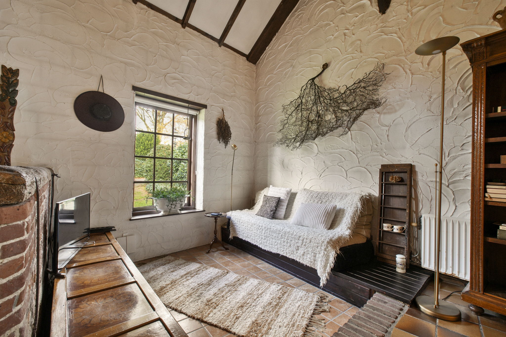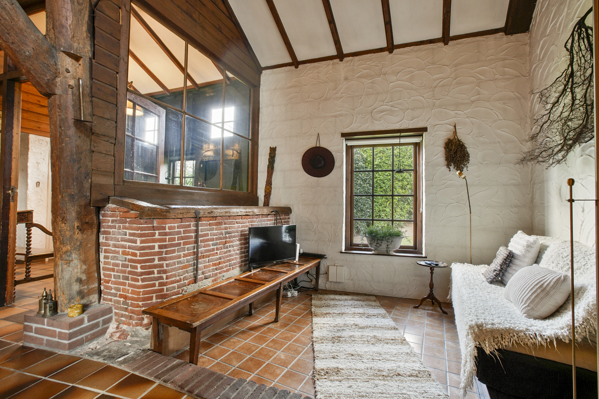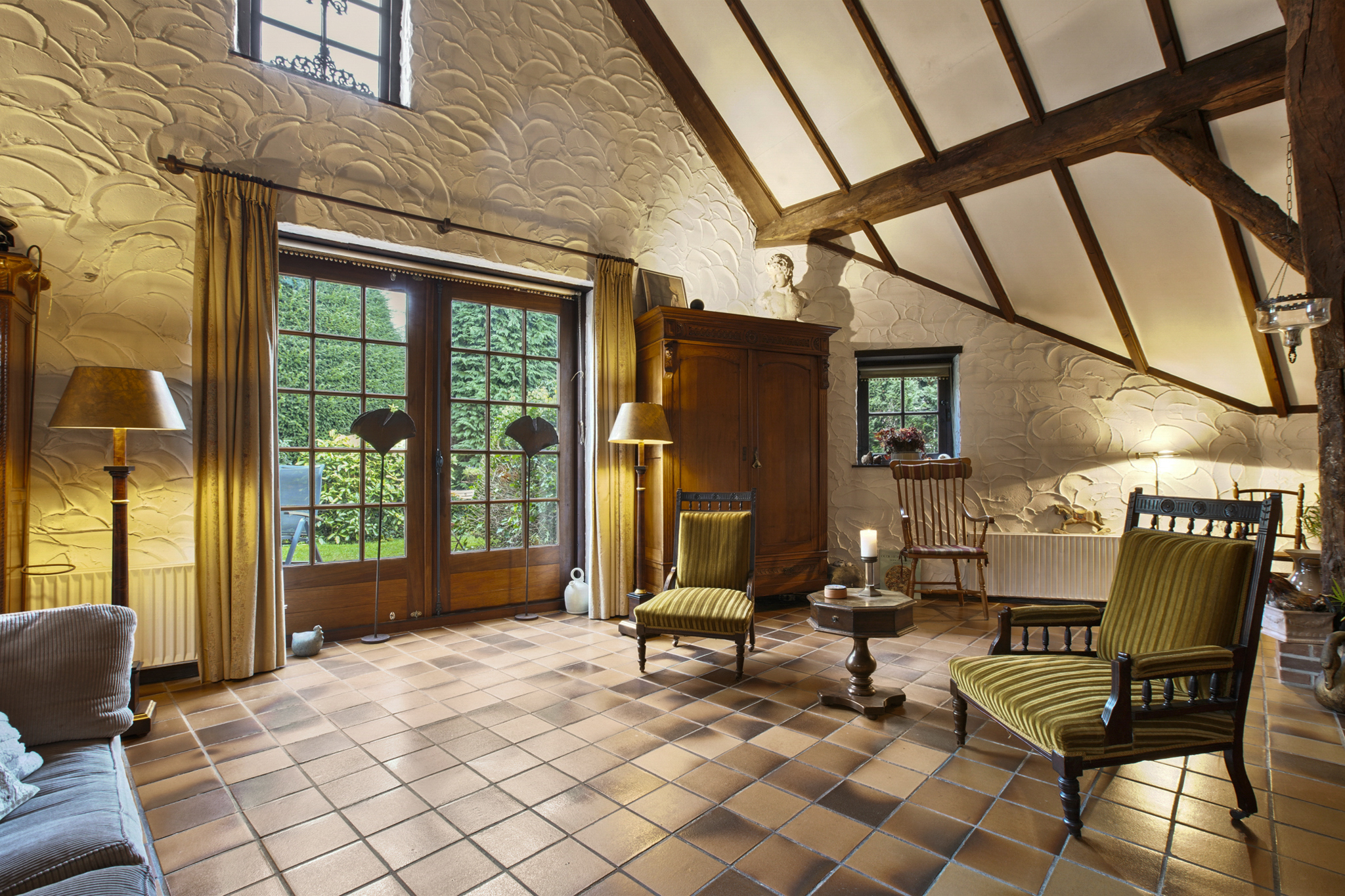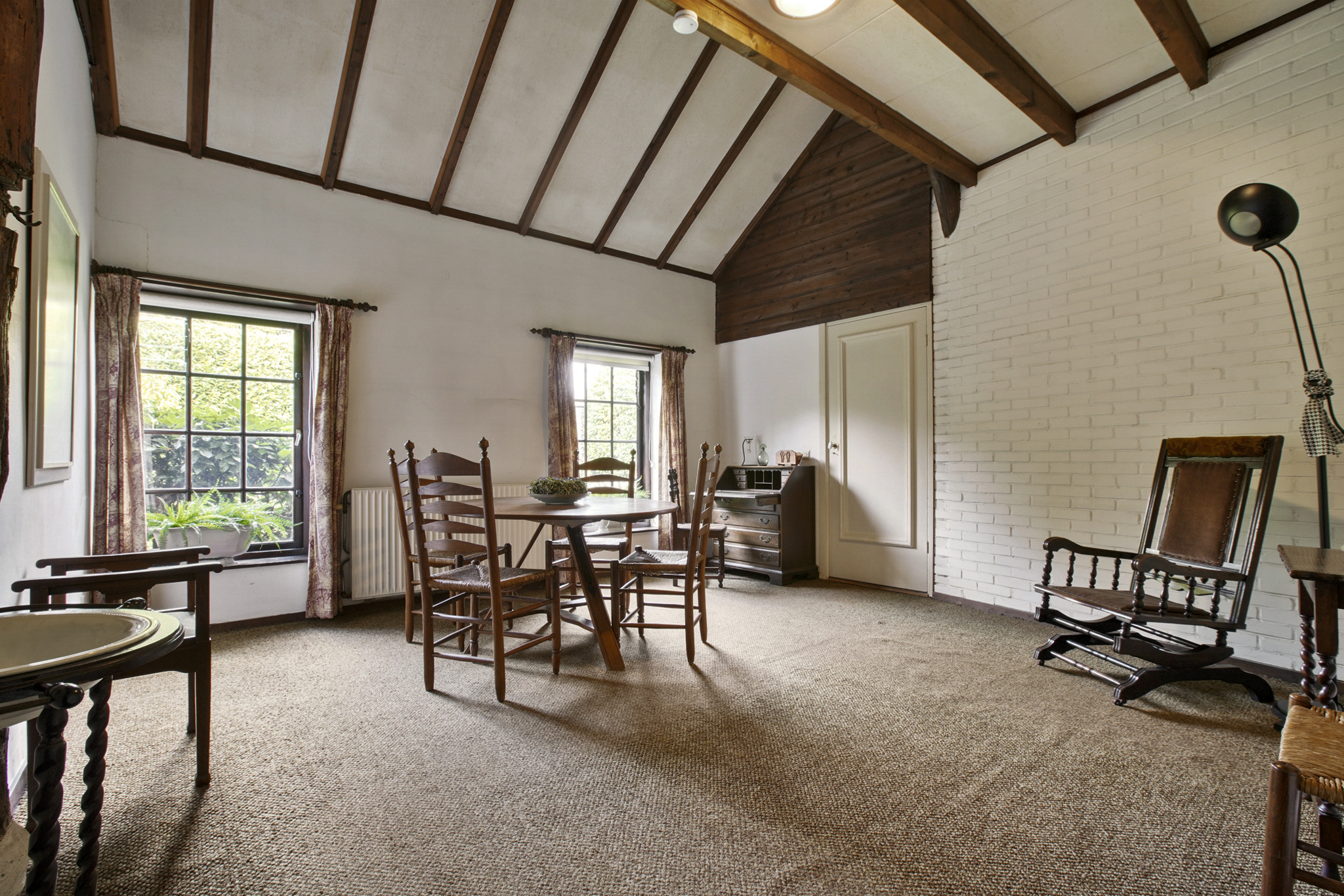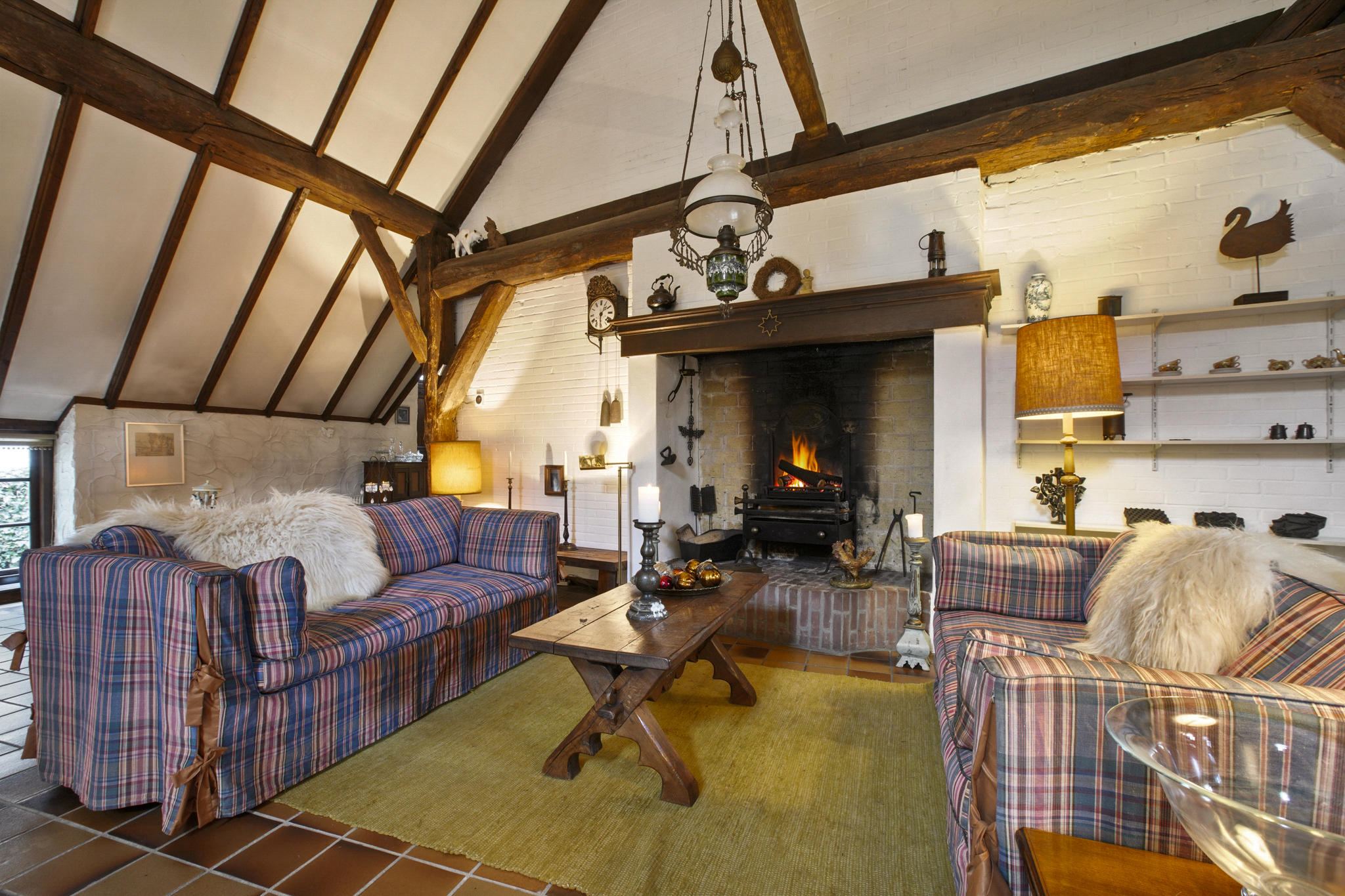 Via de boerendeur in de grote staldeuren, betreedt u de royale entree met toilet en meterkast. Door de glazenwanden valt direct uw oog op de indrukwekkende woonkamer – de voormalige stal – met een hoogte van 5.25 meter en sfeer die u zelden ziet. De woonkamer van maar liefst 93 m2 heeft een prachtig hoog balkenplafond, een sfeervolle openhaard, authentieke stalramen en openslaande deuren naar de zij-tuin.