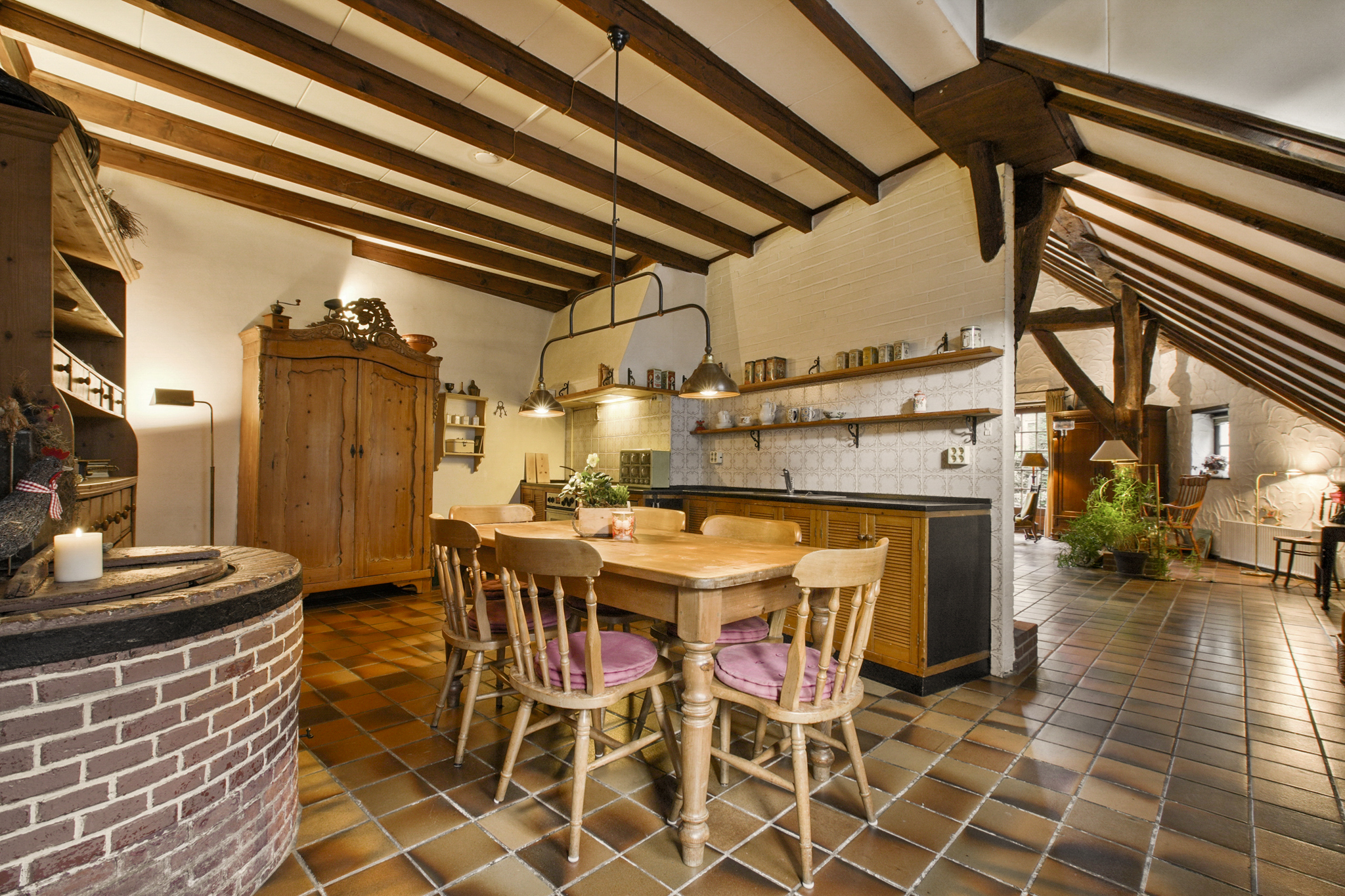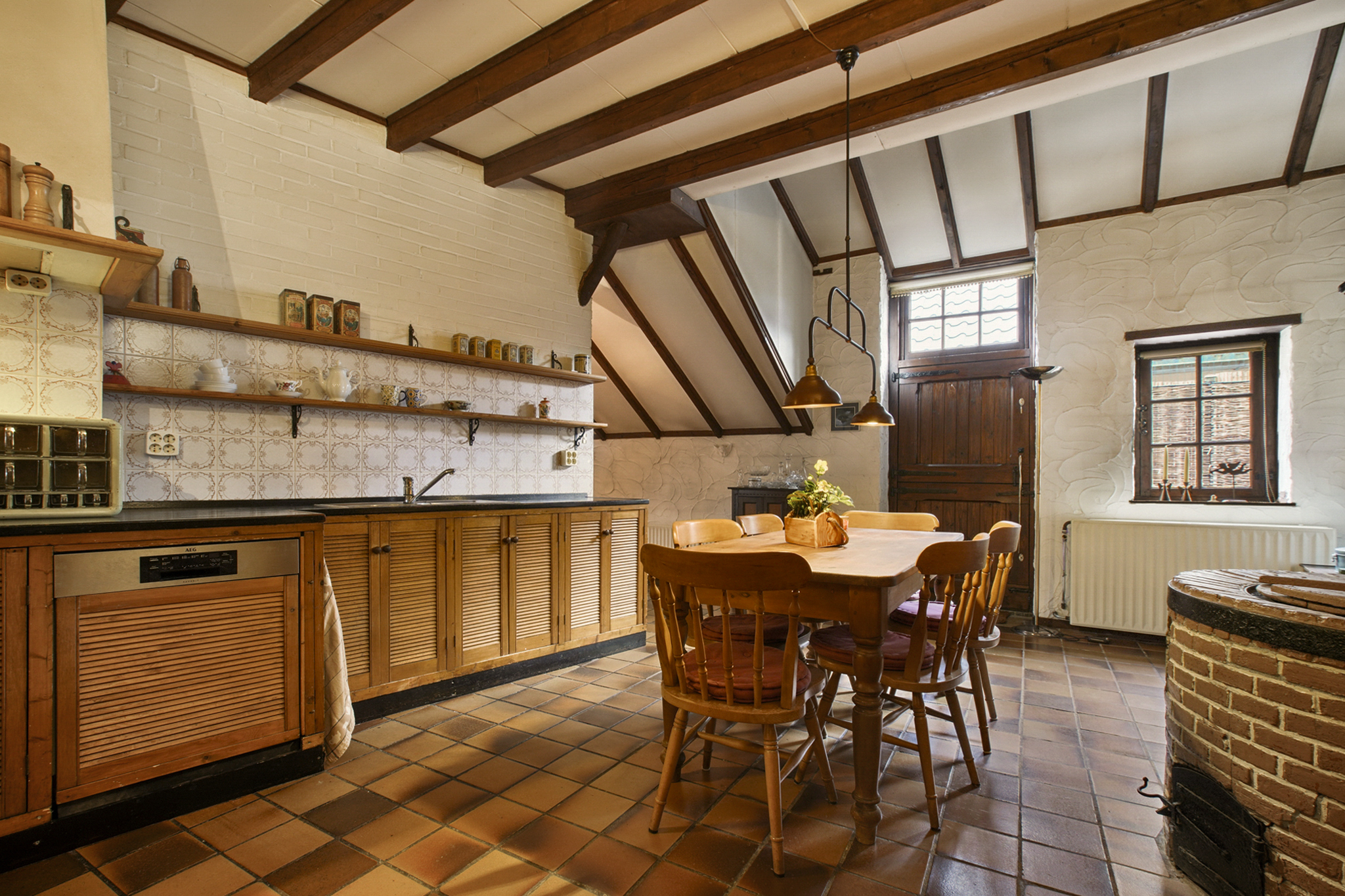 De halfopen woonkeuken ligt naast de woonkamer en is voorzien van inbouwapparatuur, waaronder een elektrisch kookplaat met afzuigkap, vaatwasser en oven. Een bijzonder detail is de originele gemetselde wasketel uit 1600, die het verleden van deze boerderij tastbaar maakt. Via de tweede boerendeur bereikt u de achterzijde van het huis. Vanuit de keuken komt u in een ruimte die nu als waskamer dienstdoet. Tevens geeft deze ruimte toegang naar de wijnkelder.