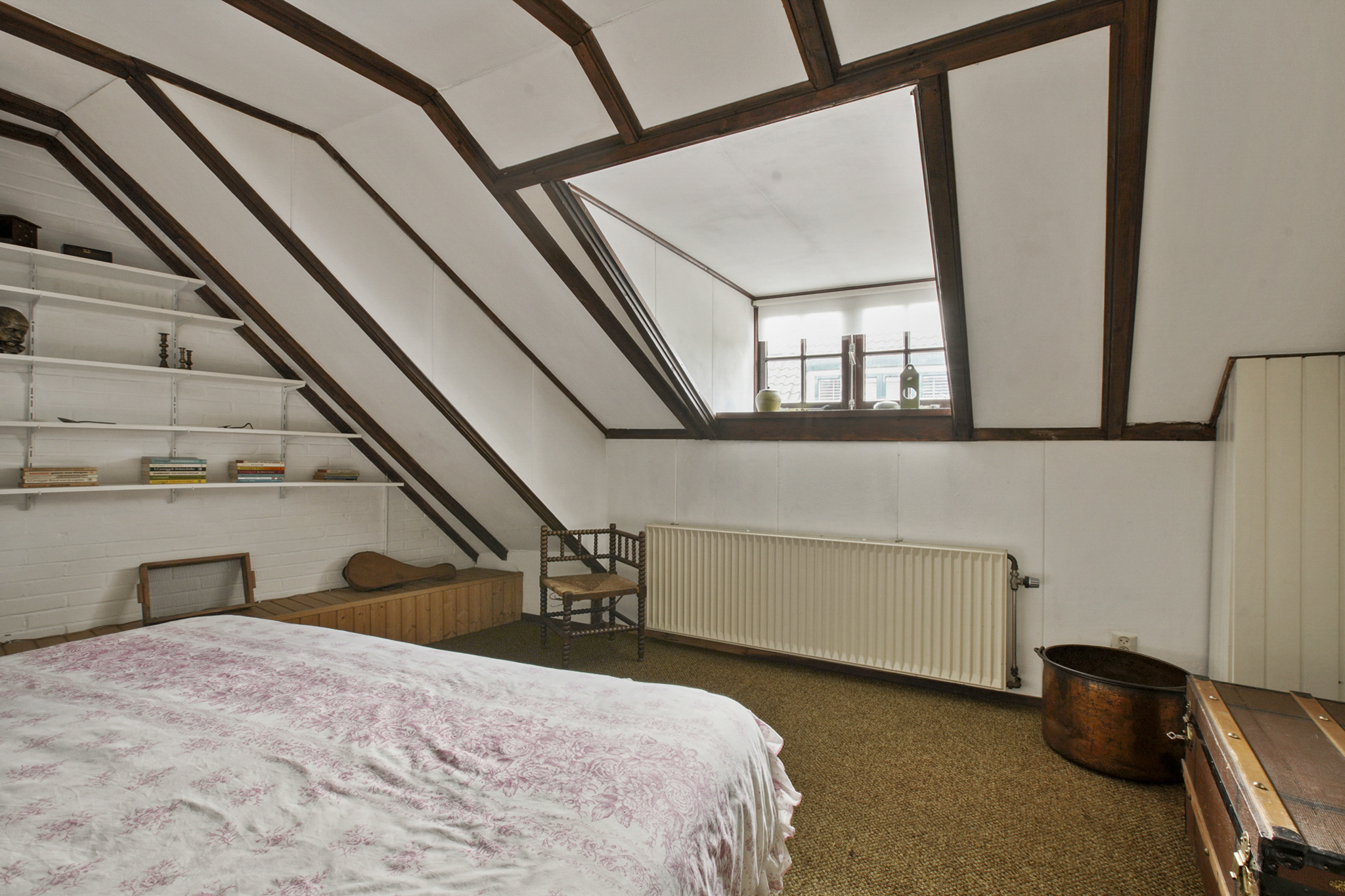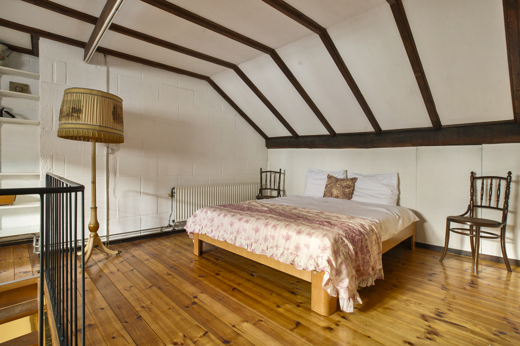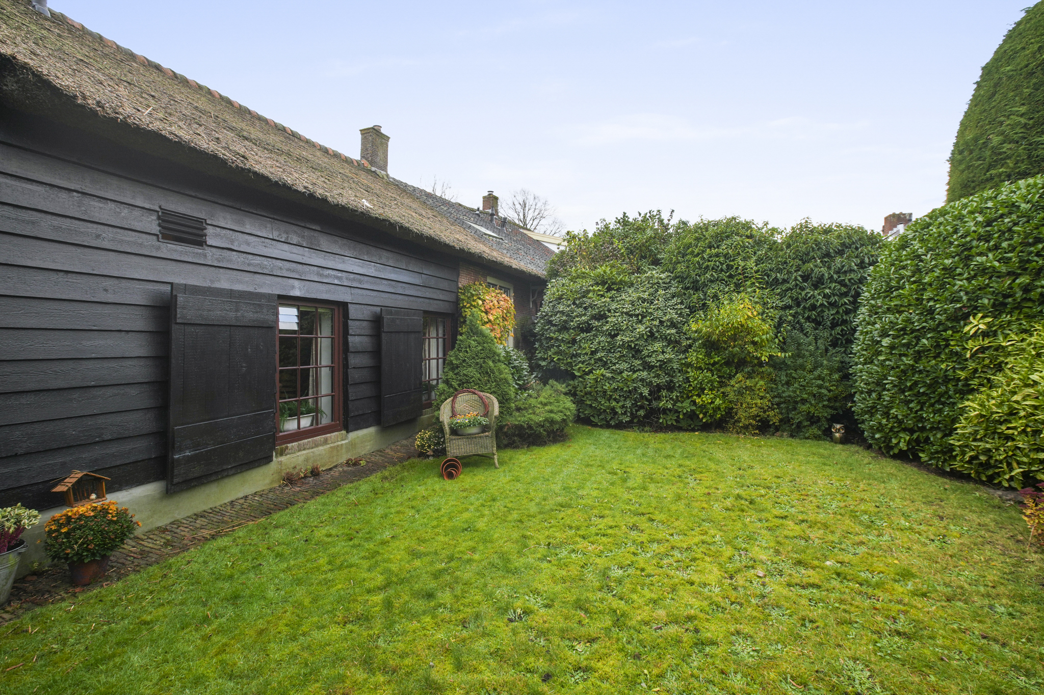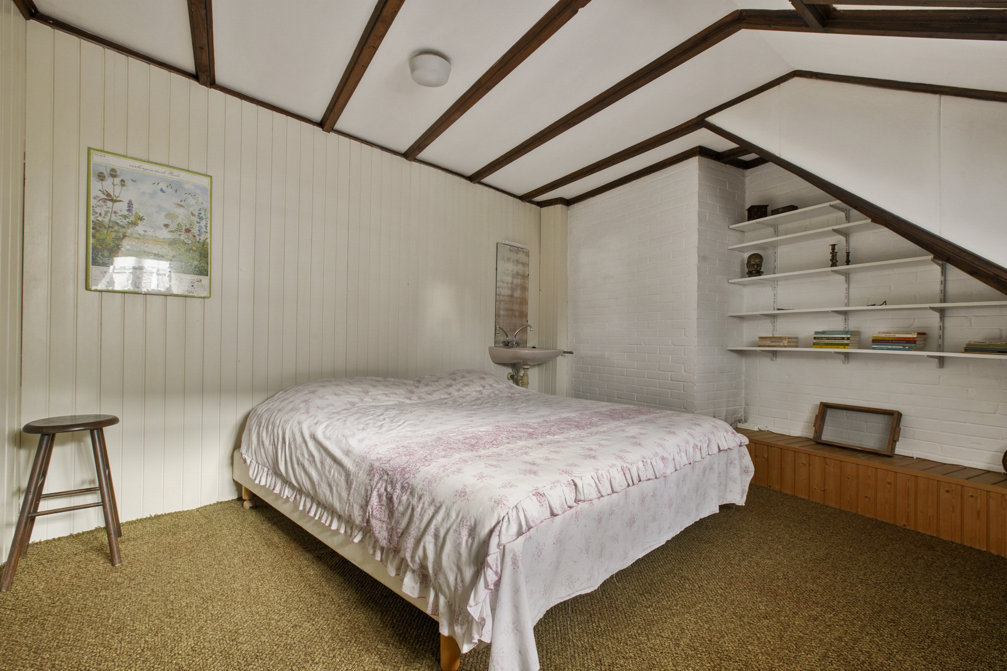 De vaste trap brengt u naar een open ruime overloop met een sfeervolle slaapkamer en ruimte voor een studeer of werkkamer. De aangrenzende kamer voor de CV-ruimte kan worden ingericht als walk-in-closet, de vierde slaapkamer met wastafel ligt aan de achterzijde. Op deze verdieping is extra bergruimte achter de knieschotten. De boerderij ligt aan een rustige steeg, waardoor u optimaal privacy en rust geniet. De zuid gerichte voortuin van ca. 280 m2 groot, biedt volop ruimte om te genieten van het buitenleven. Links van de entree bevindt zich een houten berging.