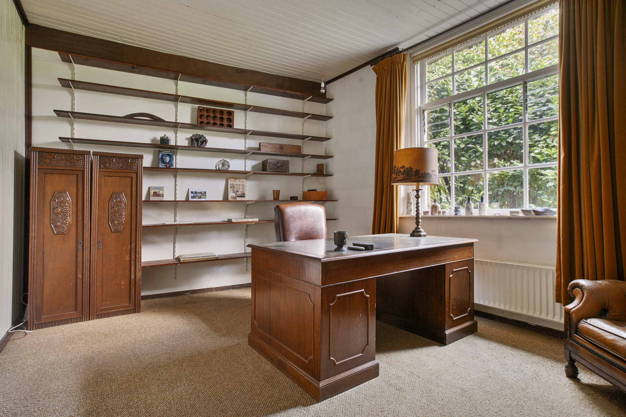 De ruime gang met vaste trap naar de eerste verdieping en met grote vaste kastenwand, geeft toegang naar o.a. de badkamer met ligbad, tweede toilet en wastafels evenals naar 2 royale kamers die veelzijdig te gebruiken zijn - als slaapkamer, werkkamer of eetkamer.