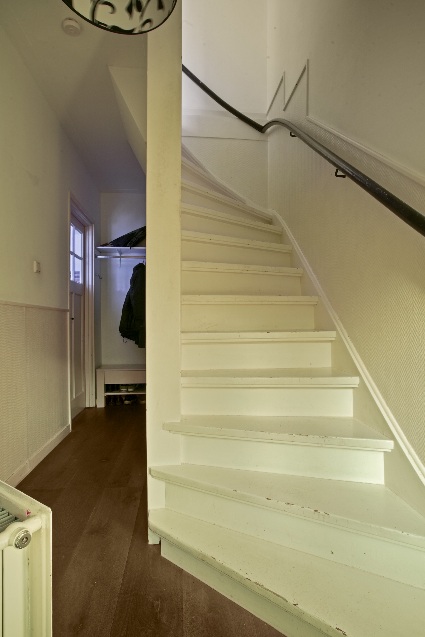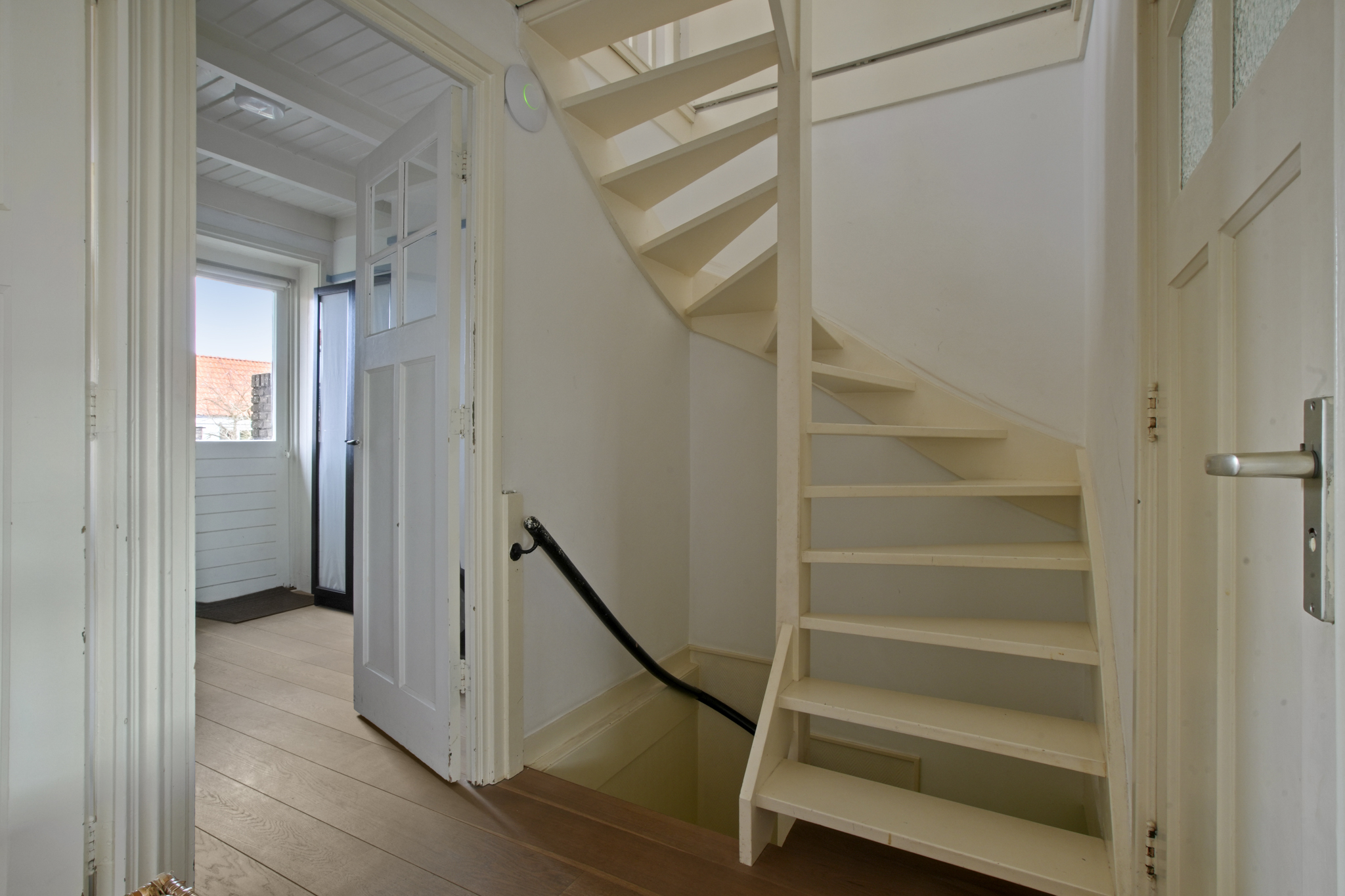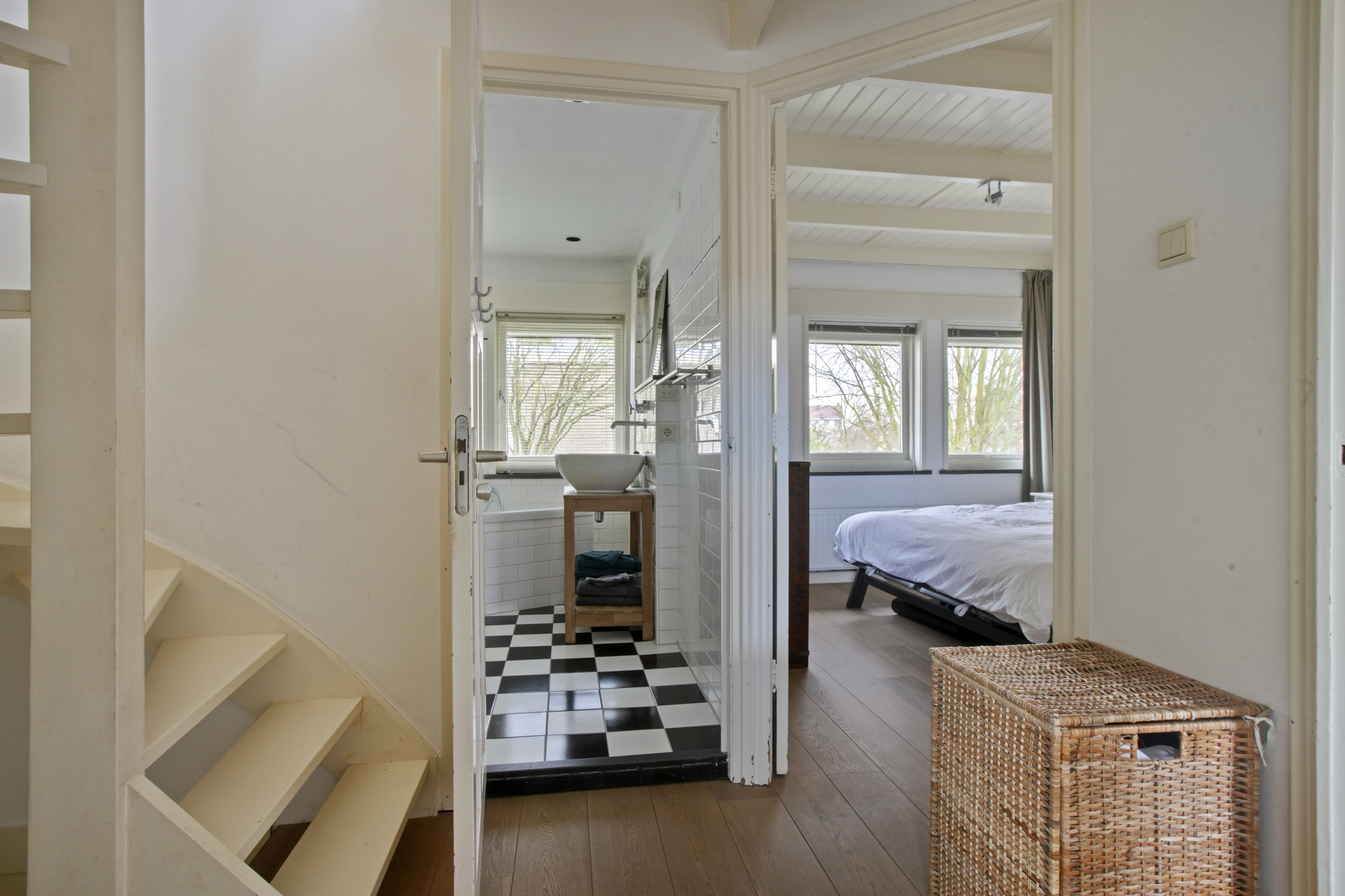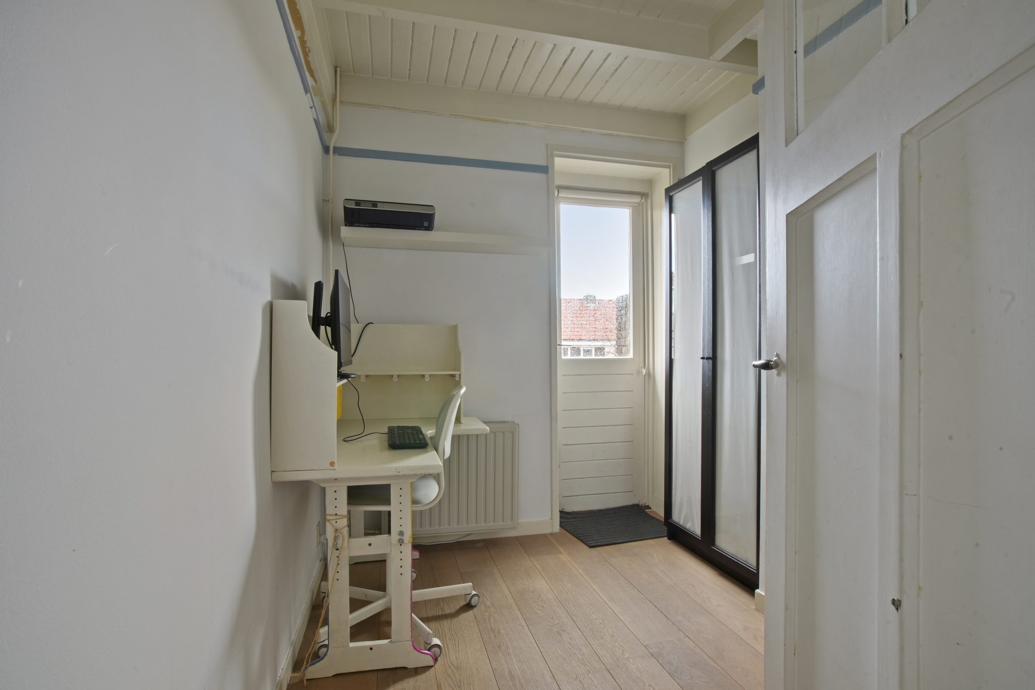 Eerste verdieping: Overloop met toegang tot drie slaapkamers: een ruime slaapkamer aan de achterzijde met vaste kast, een royale slaapkamer aan de voorzijde, een derde kleine kamer, momenteel in gebruik als werkkamer met toegang tot het zonnige dakterras. De badkamer is uitgerust met een inloopdouche, ligbad, tweede toilet en wastafel. De originele paneeldeuren geven deze verdieping extra karakter. De gehele verdieping is voorzien van een parketvloer.