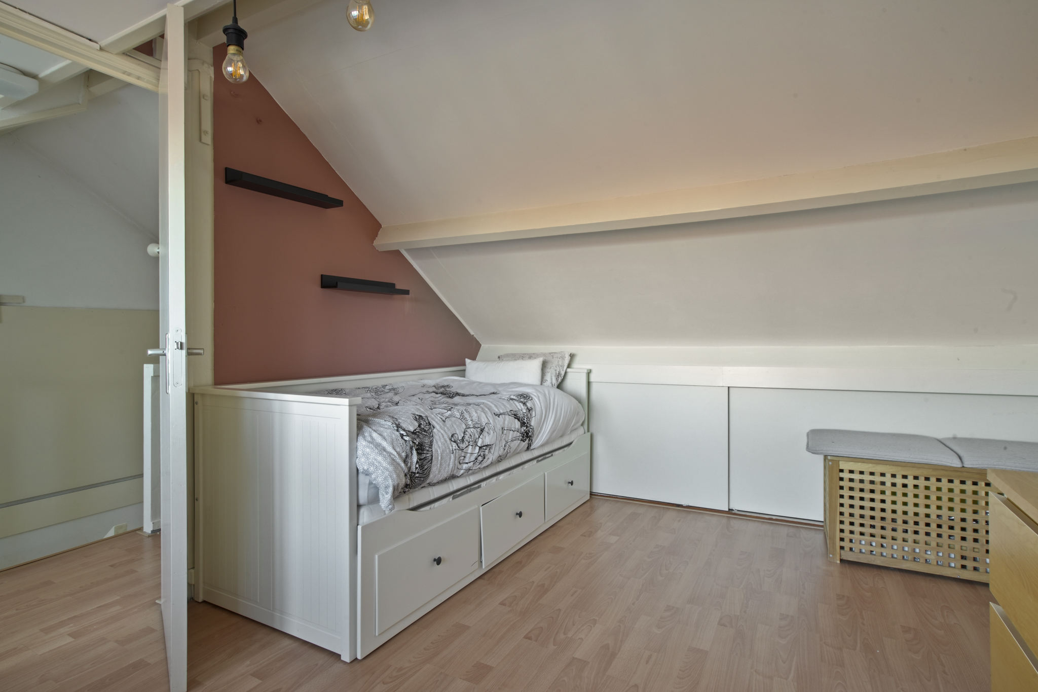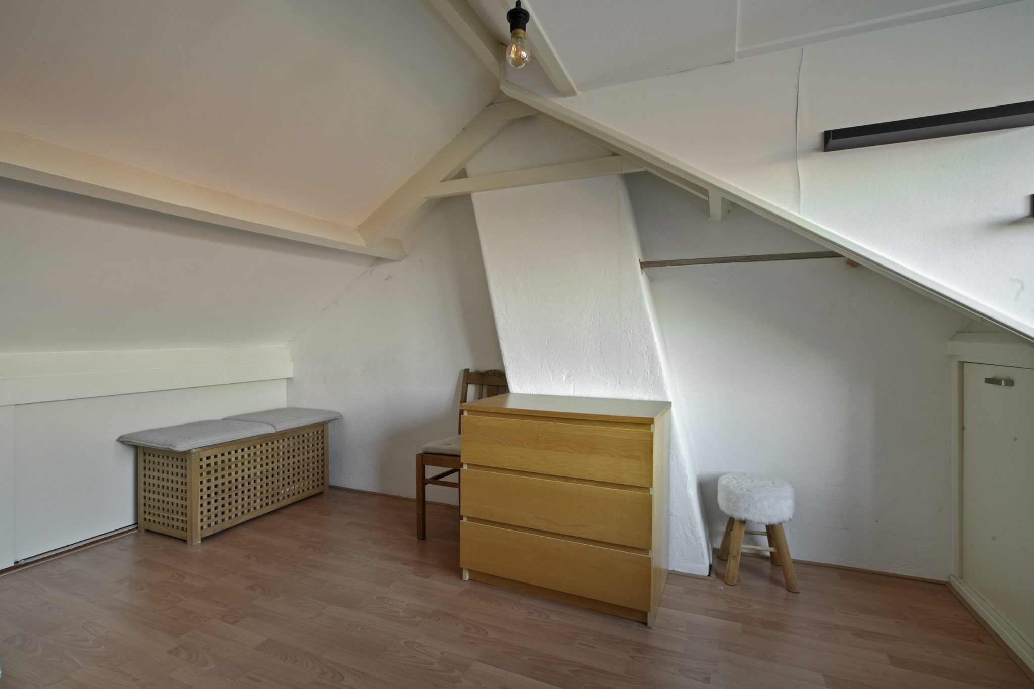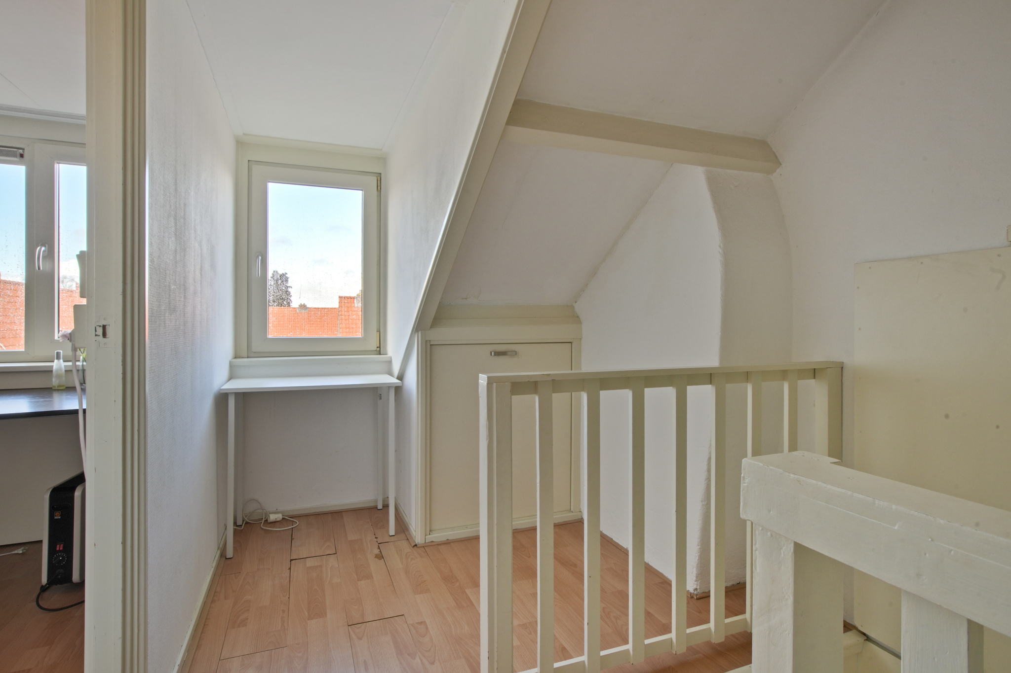 Zolderverdieping: Via een vaste trap bereikt u de voorzolder met dakraam en bergruimte. Aansluitend bevindt zich de vierde slaapkamer met dakkapel en extra bergruimte. Deze verdieping is afgewerkt met een laminaatvloer.