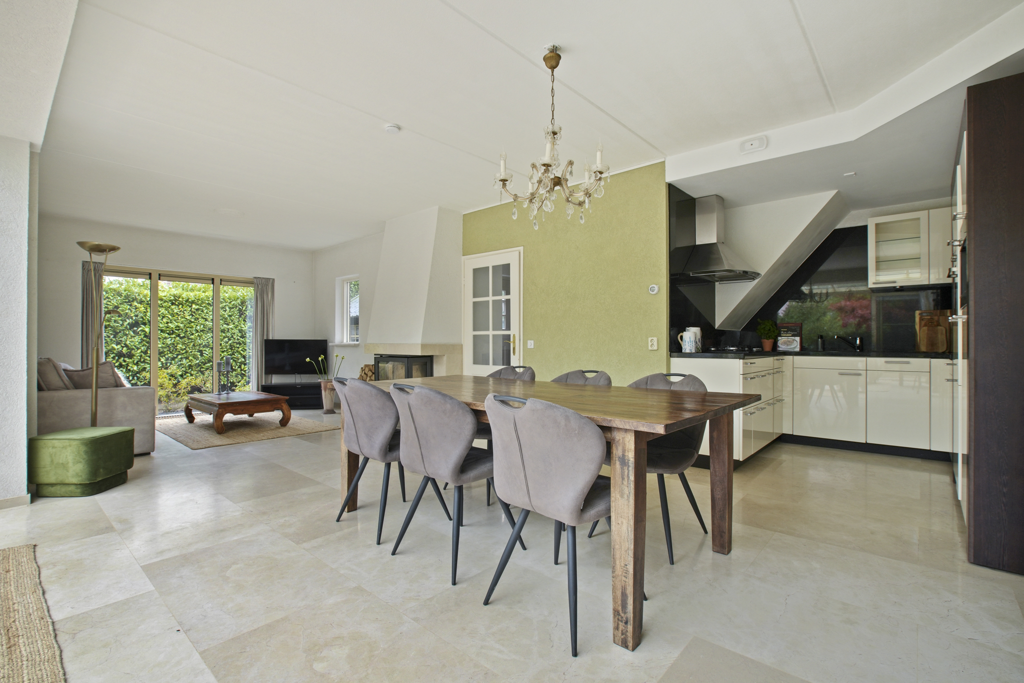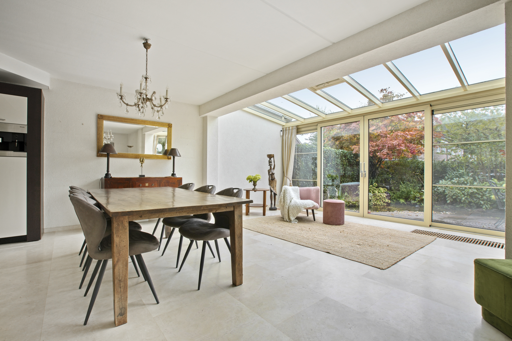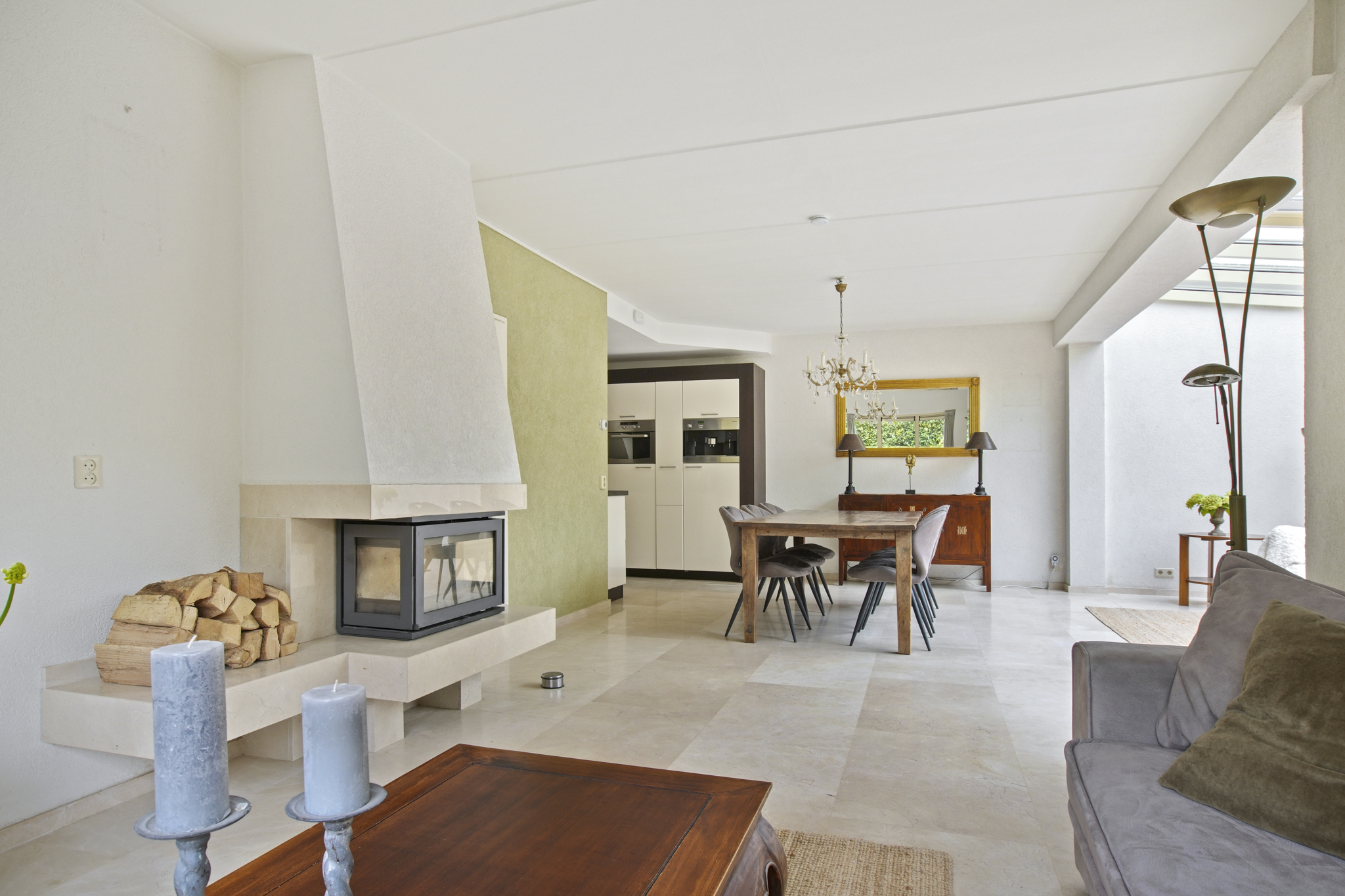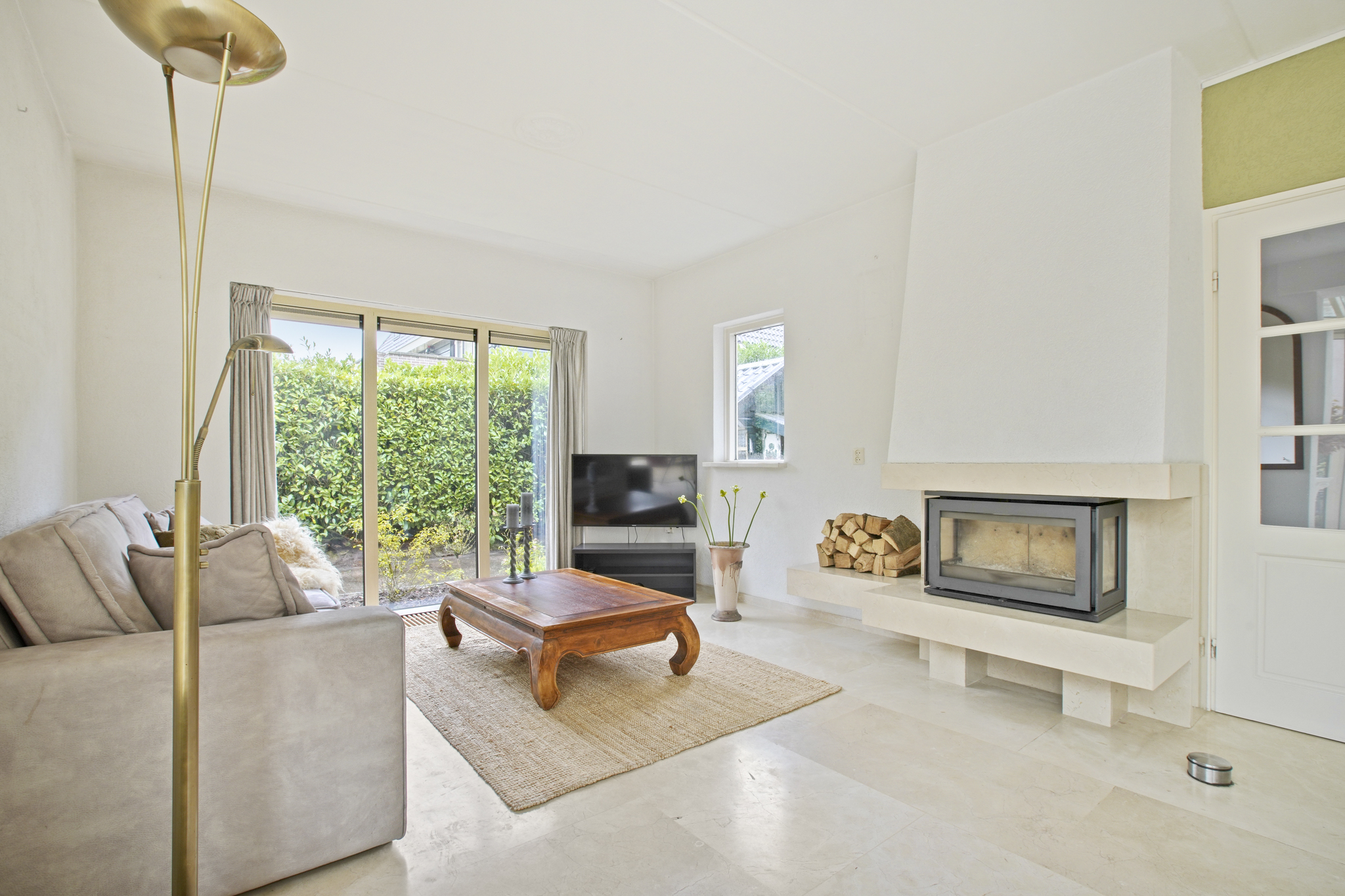 De voormalige garage is omgebouwd tot een extra kamer, ideaal als praktijkruimte, kantoor of speelkamer. Aangrenzend bevindt zich een praktische bijkeuken met aansluitingen voor wasmachine en droger. De entree geeft toegang tot de hal met toilet en fonteintje. De ruime en lichte woonkamer met serre beschikt over een sfeervolle open haard met haarddeur en een schuifpui naar de zonnige tuin. De open keuken is uitgerust met diverse inbouwapparatuur waaronder een gasfornuis met afzuigkap, koelkast en combi-oven. De gehele begane grond is afgewerkt met een stijlvolle marmeren vloer.