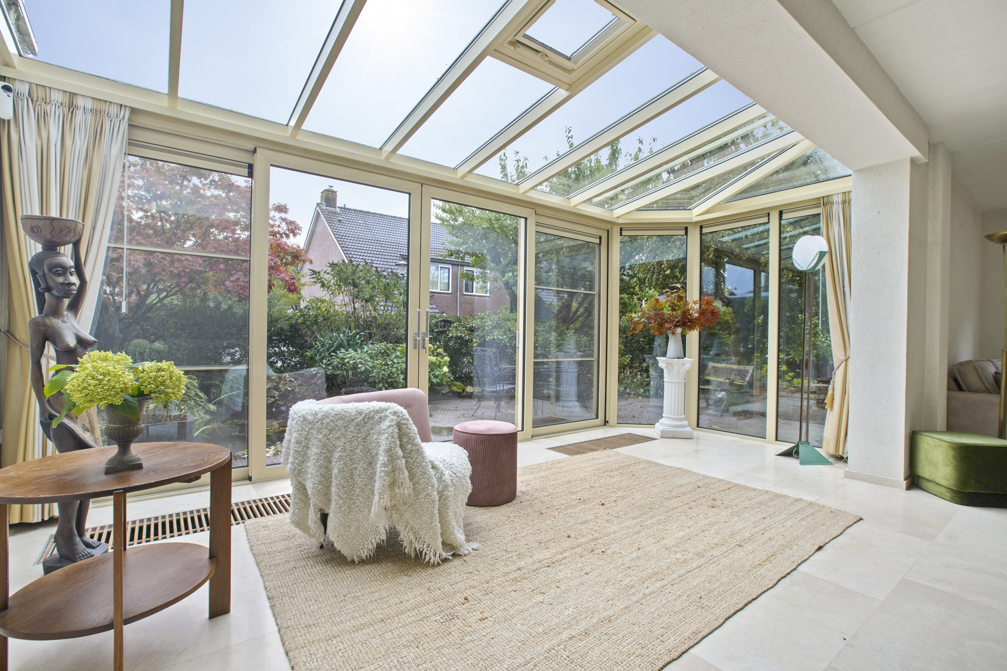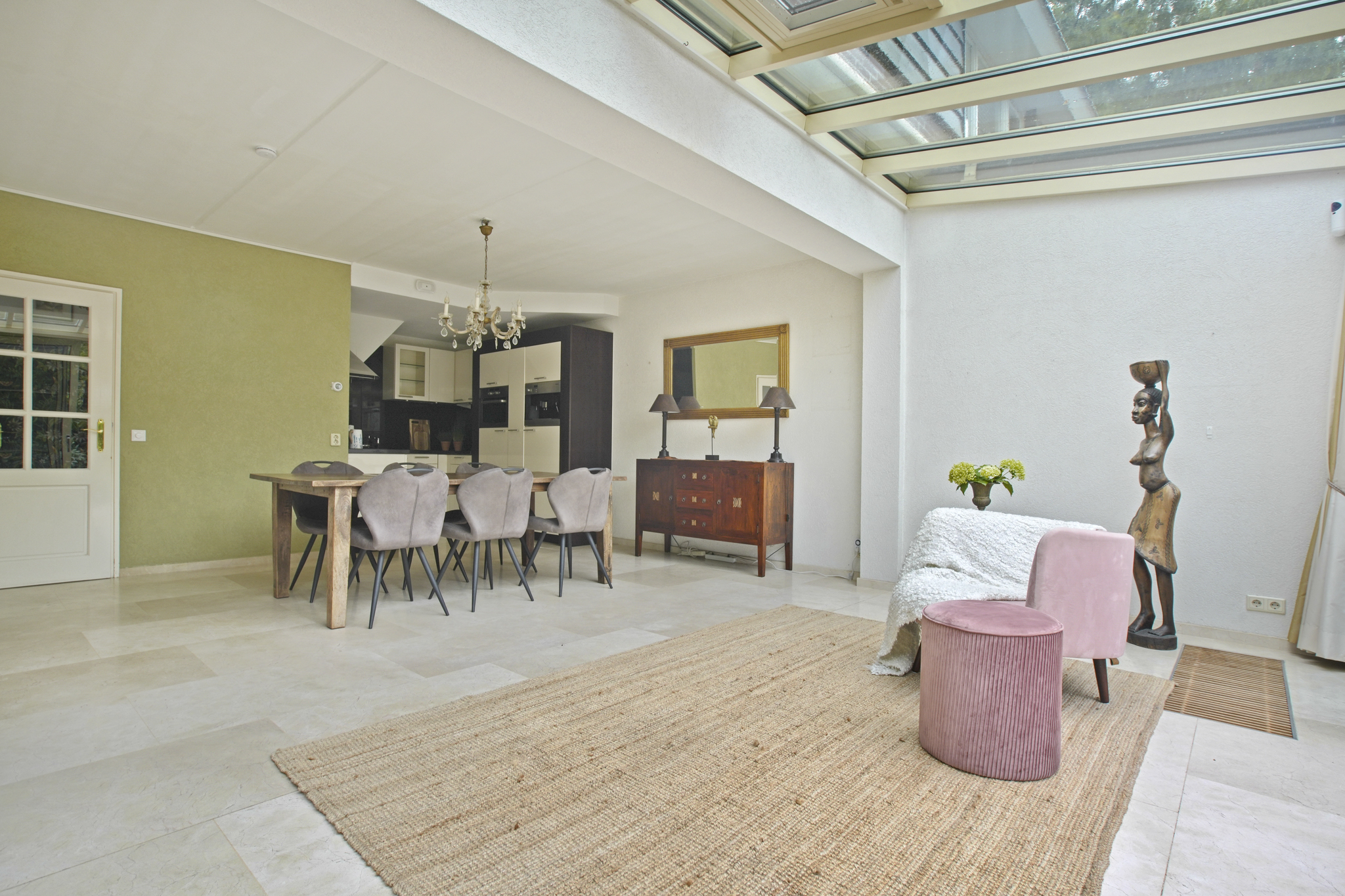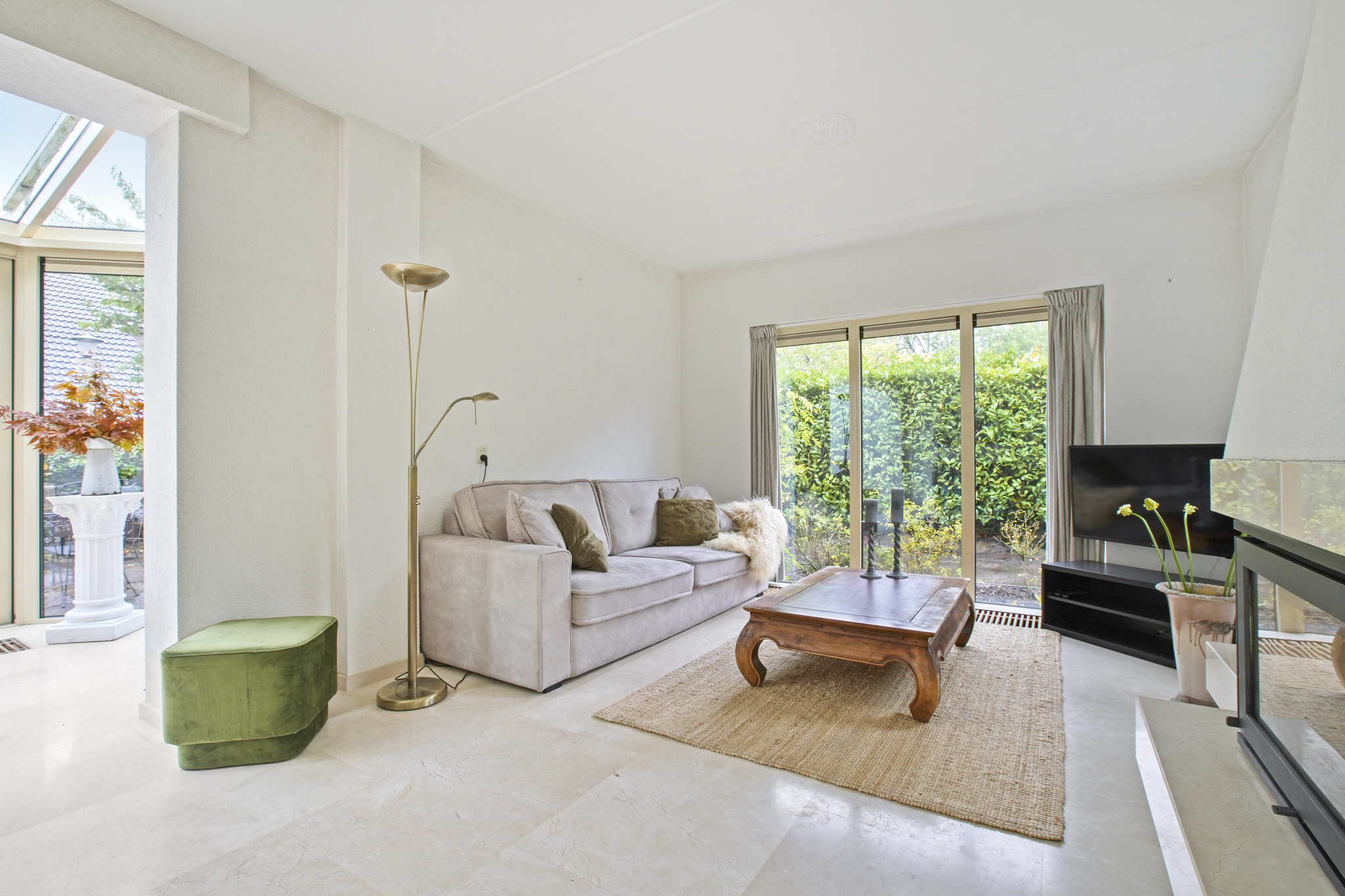 De voormalige garage is omgebouwd tot een extra kamer, ideaal als praktijkruimte, kantoor of speelkamer. Aangrenzend bevindt zich een praktische bijkeuken met aansluitingen voor wasmachine en droger. De entree geeft toegang tot de hal met toilet en fonteintje. De ruime en lichte woonkamer met serre beschikt over een sfeervolle open haard met haarddeur en een schuifpui naar de zonnige tuin. De open keuken is uitgerust met diverse inbouwapparatuur waaronder een gasfornuis met afzuigkap, koelkast en combi-oven. De gehele begane grond is afgewerkt met een stijlvolle marmeren vloer.