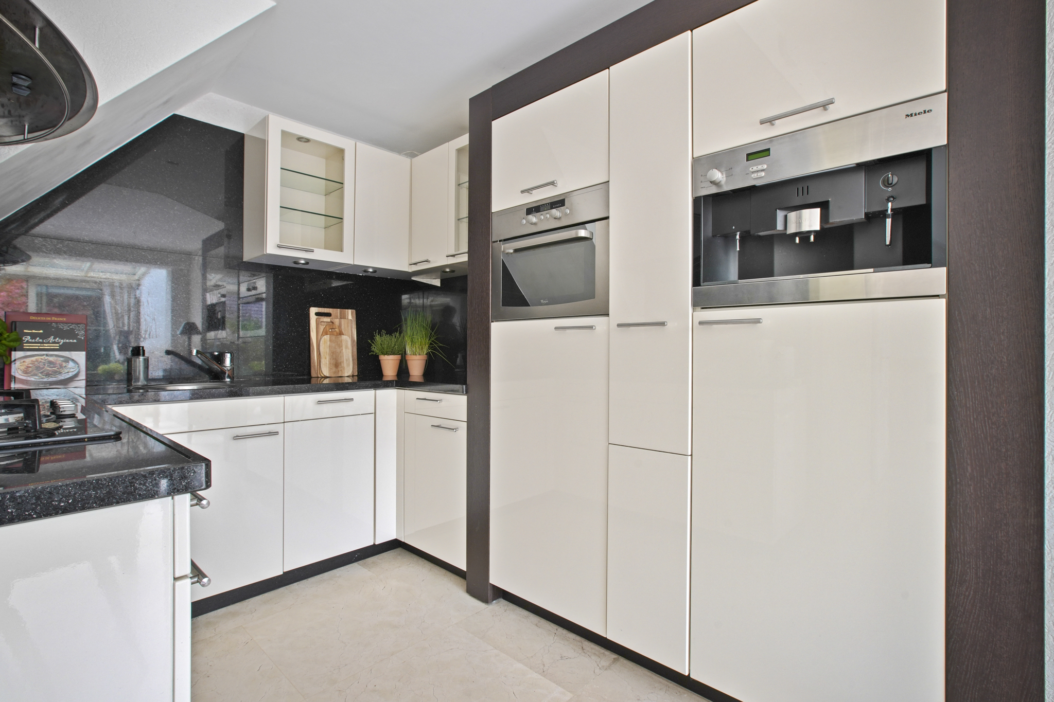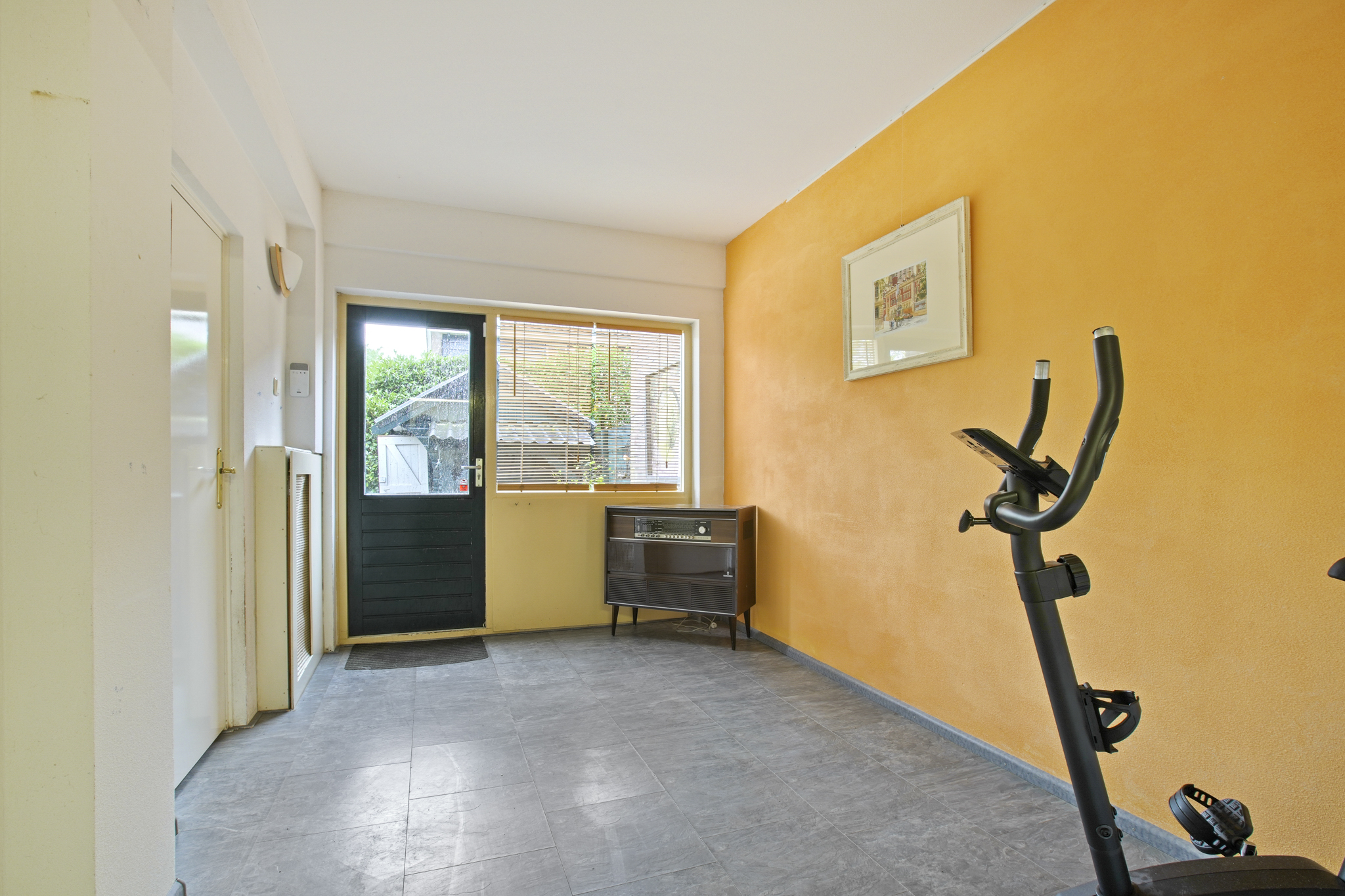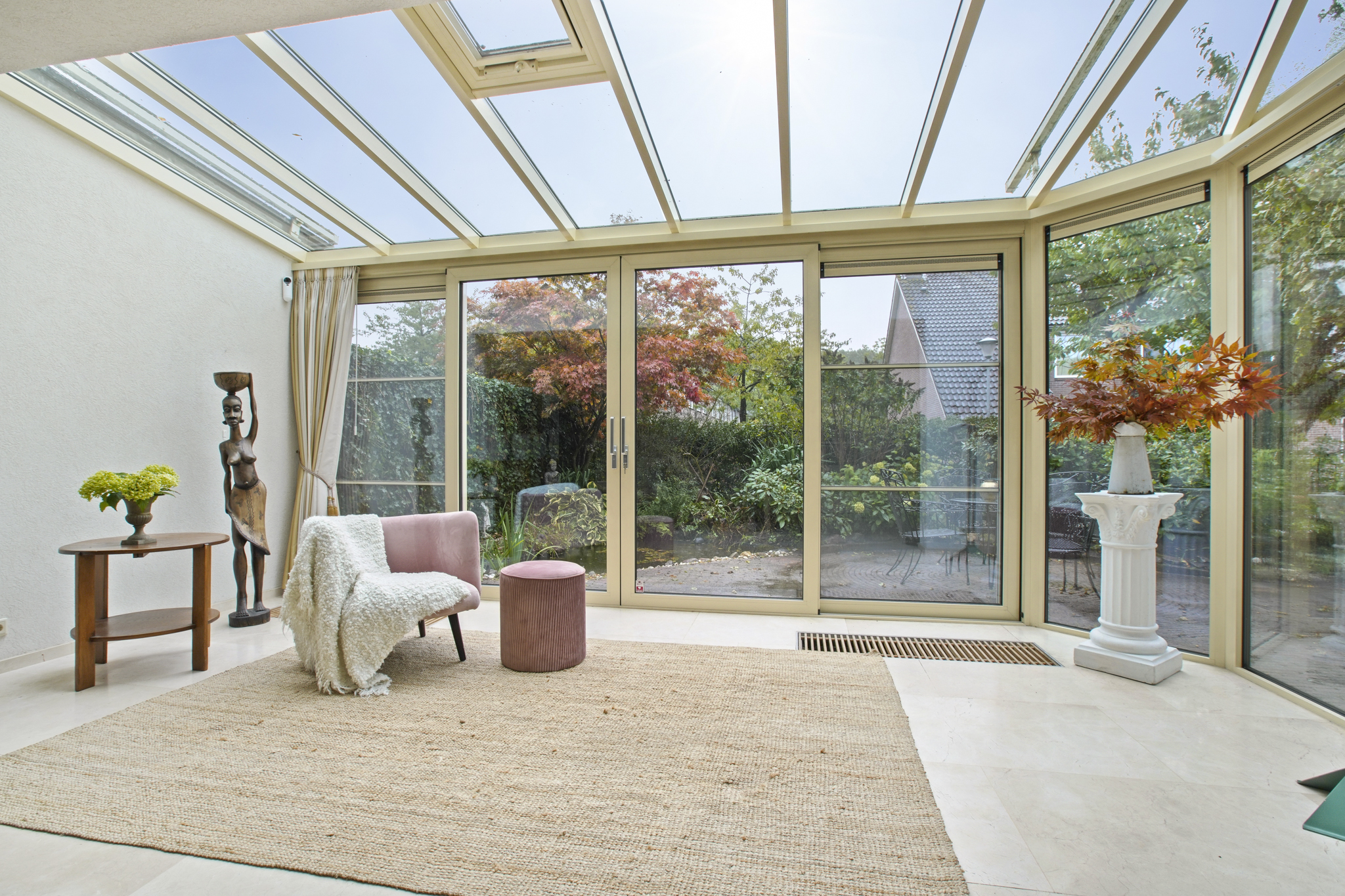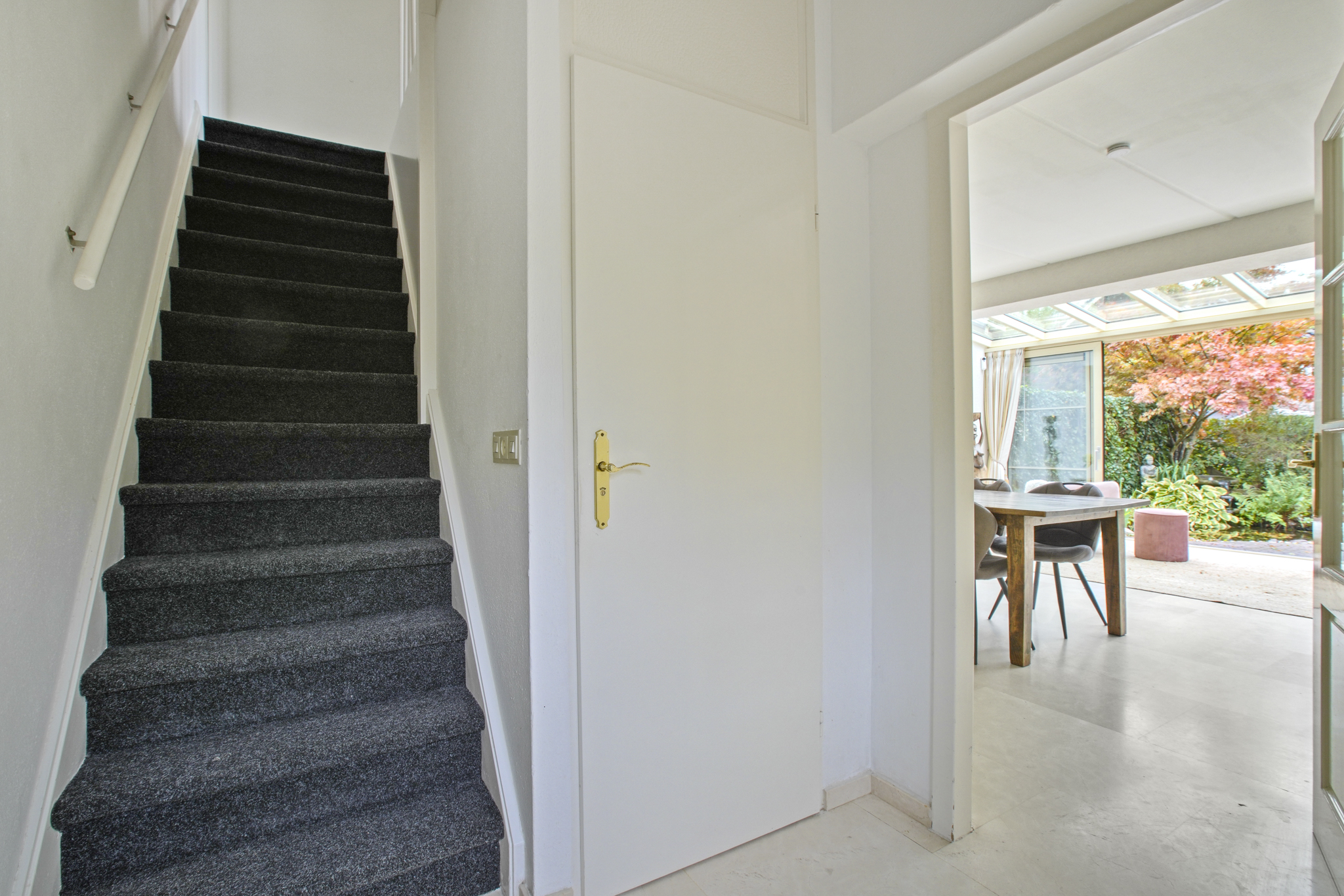De voormalige garage is omgebouwd tot een extra kamer, ideaal als praktijkruimte, kantoor of speelkamer. Aangrenzend bevindt zich een praktische bijkeuken met aansluitingen voor wasmachine en droger. De entree geeft toegang tot de hal met toilet en fonteintje. De ruime en lichte woonkamer met serre beschikt over een sfeervolle open haard met haarddeur en een schuifpui naar de zonnige tuin. De open keuken is uitgerust met diverse inbouwapparatuur waaronder een gasfornuis met afzuigkap, koelkast en combi-oven. De gehele begane grond is afgewerkt met een stijlvolle marmeren vloer.