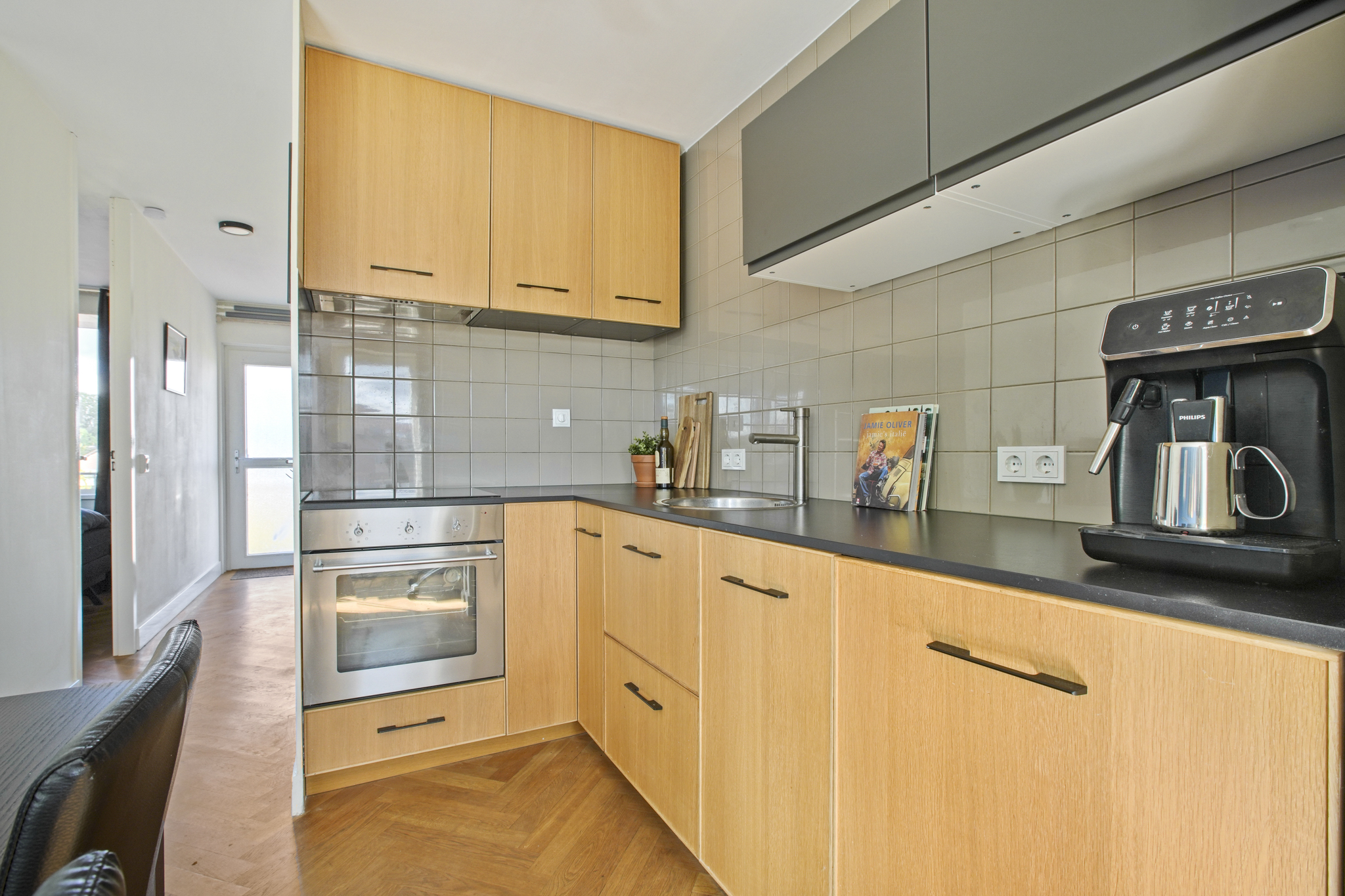 Indeling appartement: Entree met garderobe, de lichte woonkamer met open keuken geeft toegang naar het balkon aan de achterzijde met uitzicht over de aanloophaven. De keuken is voorzien van diverse inbouwapparatuur, waaronder een afzuigkap, oven, 4-pits inductieplaat, vaatwasser en koelkast met vriesvak. Aan de voorzijde ligt de ruime slaapkamer, tegenover de slaapkamer bevindt zich de moderne badkamer met inloopdouche, wastafelmeubel en hangend toilet. Daarnaast is er een handige bergkast met aansluitingen voor wasmachine en droger. Het gehele appartement is afgewerkt met een stijlvolle eiken visgraat parketvloer.